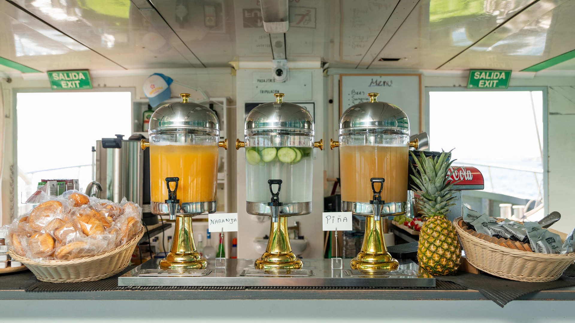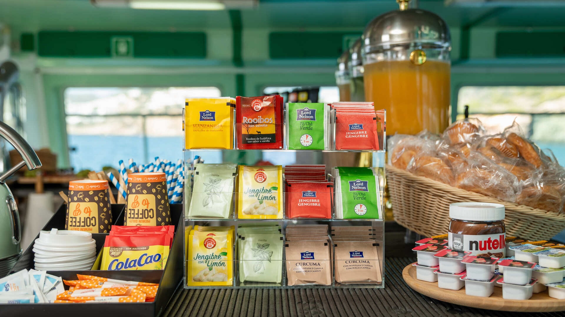 Desayuno buffet a bordo con embutidos locales, fruta fresca, pan, mermeladas, bollería, café, tés, zumos y leche chocolatada.