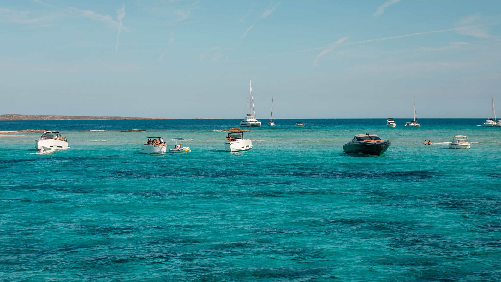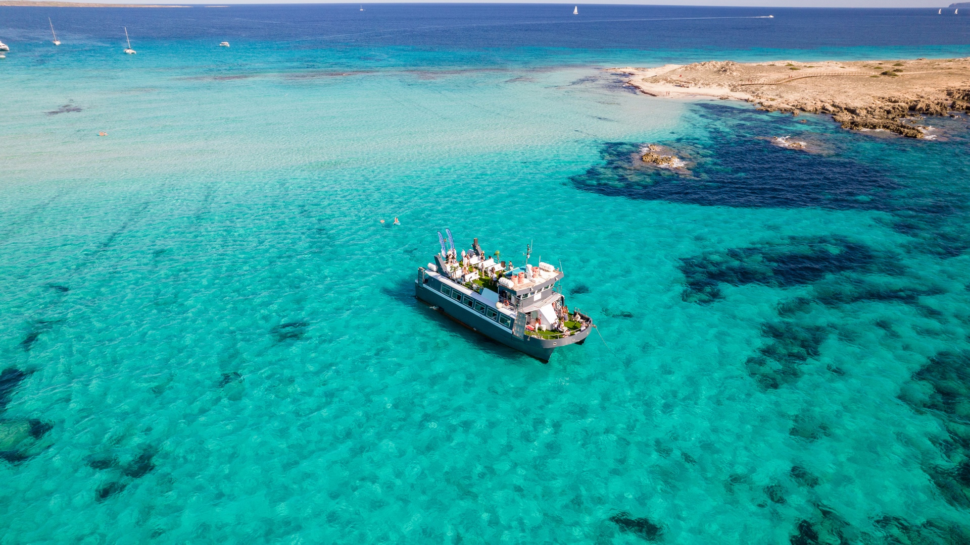Navega desde Ibiza hacia las aguas turquesas de Espalmador y Ses Illetes, con paradas para el baño, música a bordo y gastronomía local.