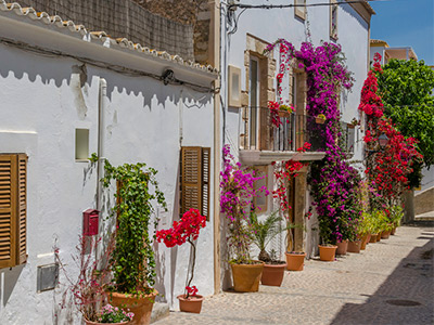 Y desde entonces, Dalt Vila se eleva rocosa sobre el blanco de las casas apiñadas en las laderas del monte Puig de Vila. En sus distintos niveles nos acompañan palmeras, buganvillas, orquídeas y otras flores de vivísimos colores. Sus calles empedradas, estrechas y sombreadas, discurren al abrigo de las palmeras, los muros encalados y los jardines que asoman desde detrás de sus tapias. En lo alto, subiendo por el Carrer Major, desembocaremos en la plaza de la Catedral: abierta al mar y al infinito Mediterráneo.