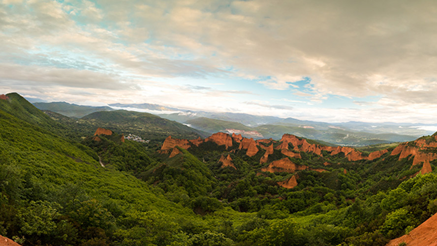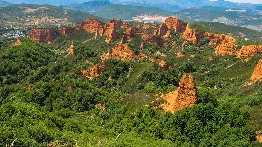 Desde este mirador, se pueden ver las formas rojizas de la montaña que han sido repobladas por robles y castaños, lo que da una mezcla rojiverde que se ha convertido en el color típico de Las Médulas.