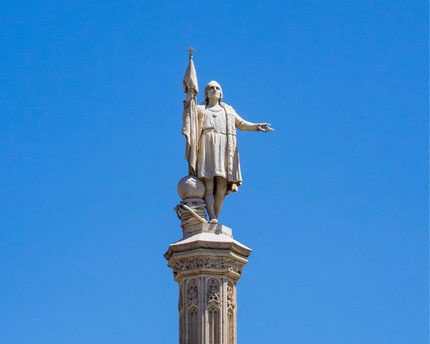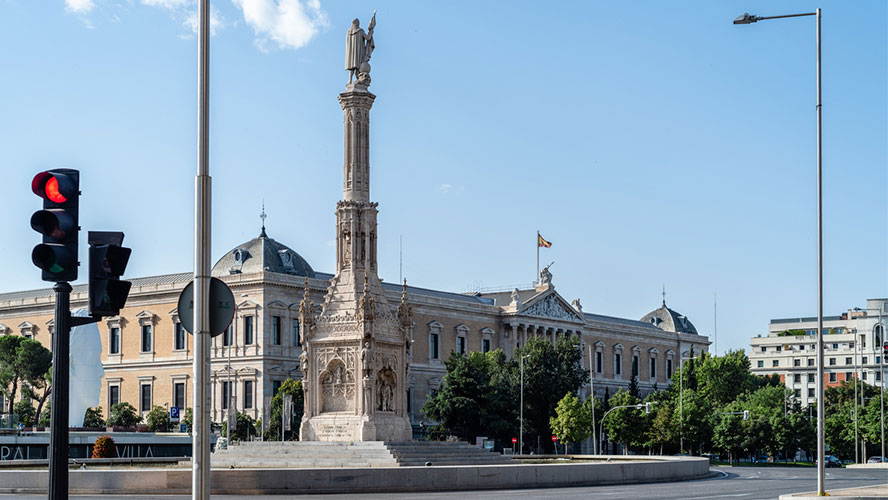 El monumento a Colón, que alcanza los 17 metros de altura, se encuentra en medio de una fuente redonda, a modo de rotonda, en plena calzada de la Plaza de Colón. Fue traslado allí desde su ubicación original (en un extremo de los Jardines del Descubrimiento) en el año 2009. Así, podría decirse que la estatua del descubridor de América se ha convertido en una auténtica reguladora del tráfico entre el norte y sur de la ciudad, y viceversa. Eso es así porque está situada en medio de uno de los ejes viarios más importantes de Madrid: la unión entre los paseos de Recoletos y de La Castellana. El monumento fue erigido inicialmente entre los años 1881 y 1885, aunque su inauguración oficial, sin grandes celebraciones por parte del Ayuntamiento se aplazó hasta el 12 de octubre de 1892, coincidiendo con el IV Centenario del Descubrimiento de América.