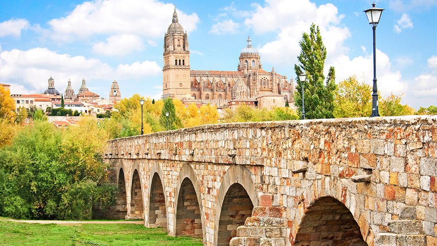 El Puente Romano de Salamanca, más conocido como Puente Mayor del Tormes en homenaje al río que baña Salamanca, data nada menos que del siglo I, de los tiempos de Trajano. Tiene un recorrido peatonal de unos 350 metros y desde el mismo se pueden tomar bonitas fotografías del río Tormes y de la ciudad vieja. En uno de los extremos del puente, en la zona de la muralla, se encuentran otros dos emblemas de Salamanca: el Verraco, un toro de piedra sin cabeza, y la estatua del Lazarillo de Tormes.