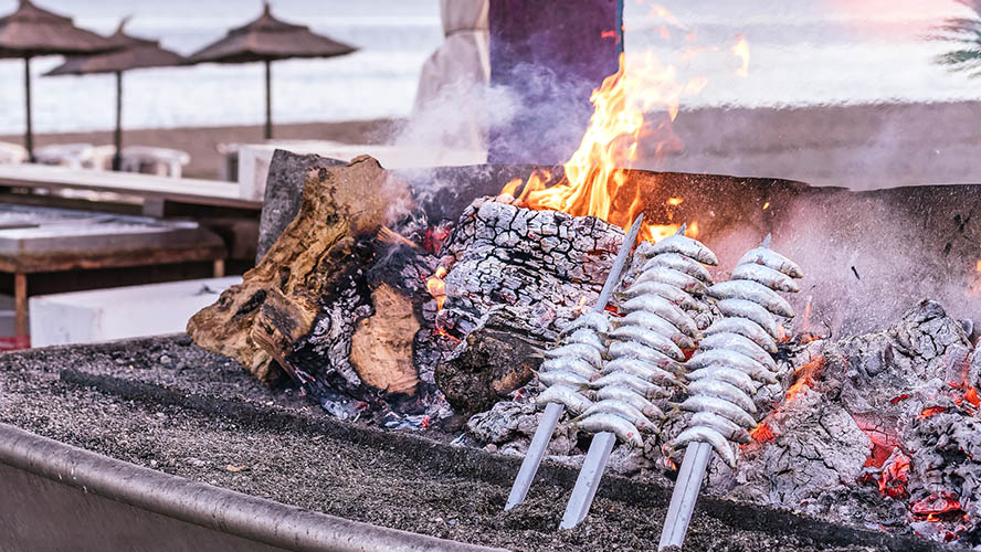 Los espetos de sardinas se pinchan sobre la arena y se hacen al calor de brasas de leña, que les aportan un característico aroma ahumado. Muy importante: nada de cuchillo y tenedor; las sardinas se comen con las manos y recién desensartadas del espeto.