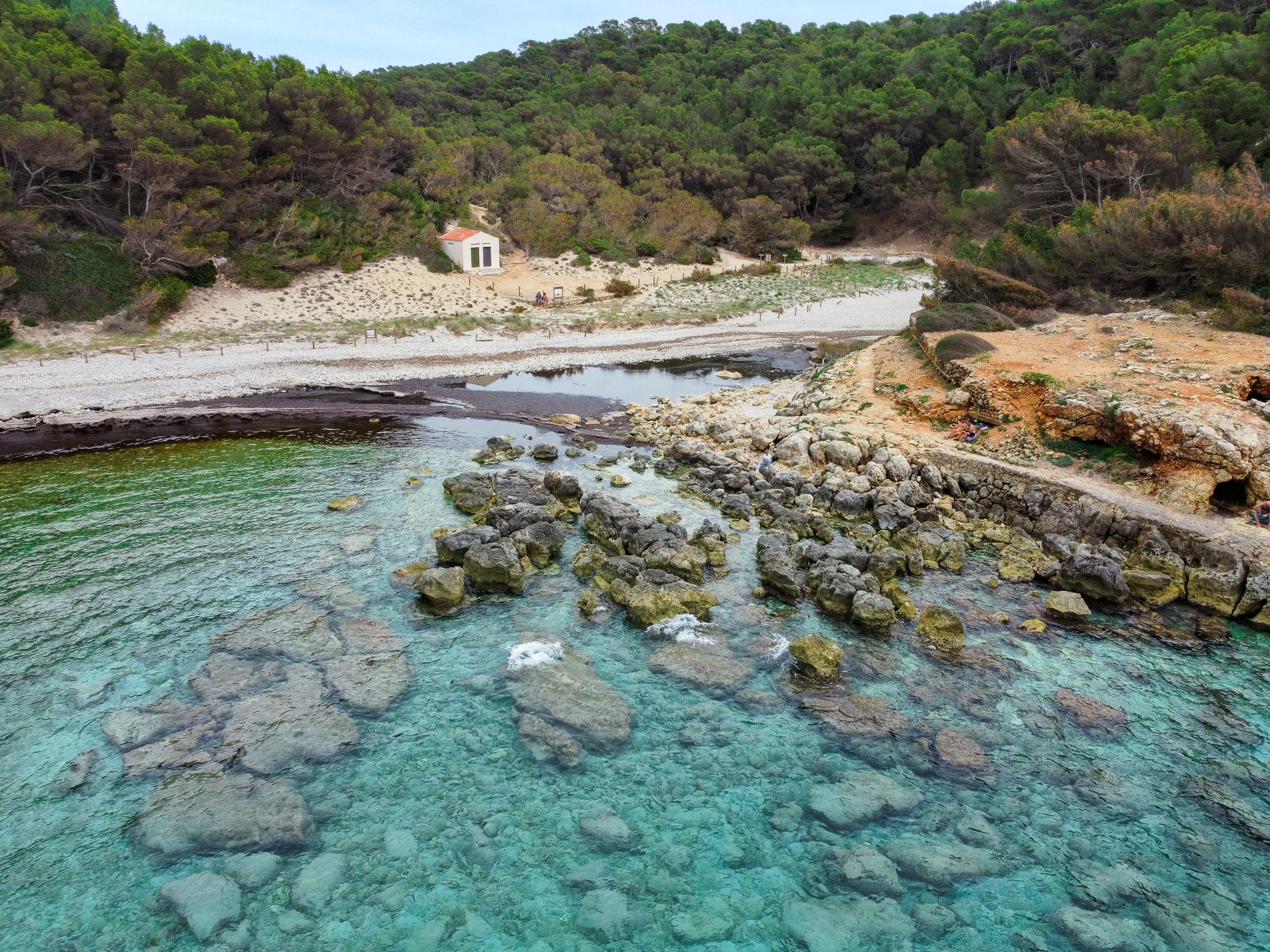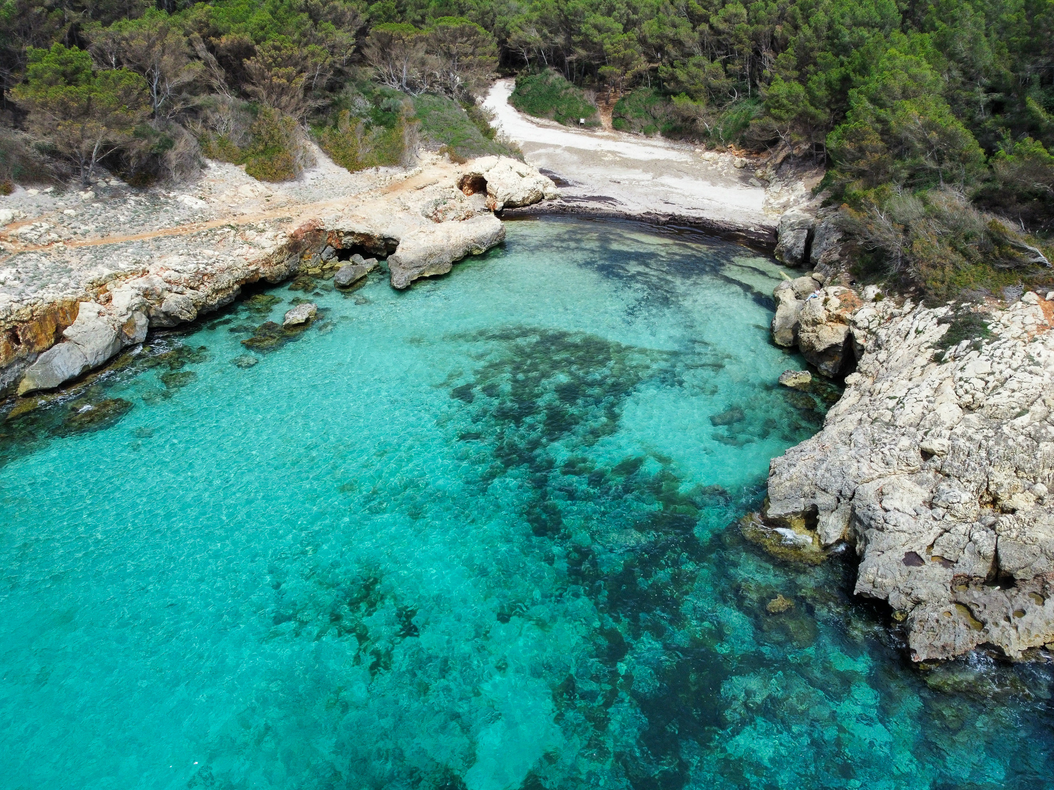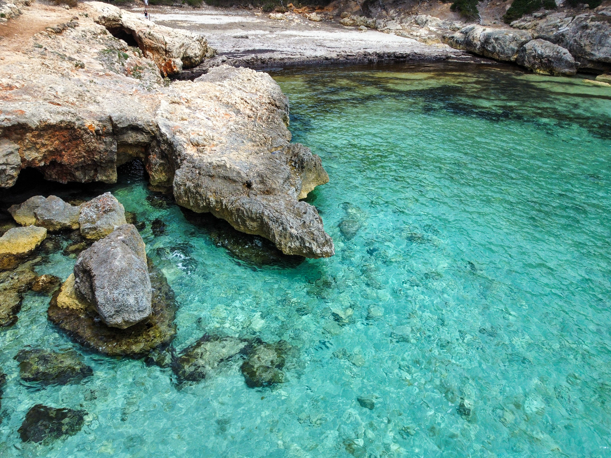 Acurrucada entre acantilados escarpados y exuberante vegetación, Cala Escorxada es una verdadera joya, intacta por las multitudes. Su arena blanca prístina y sus aguas cristalinas turquesas te invitan a sumergirte en el abrazo de la naturaleza.