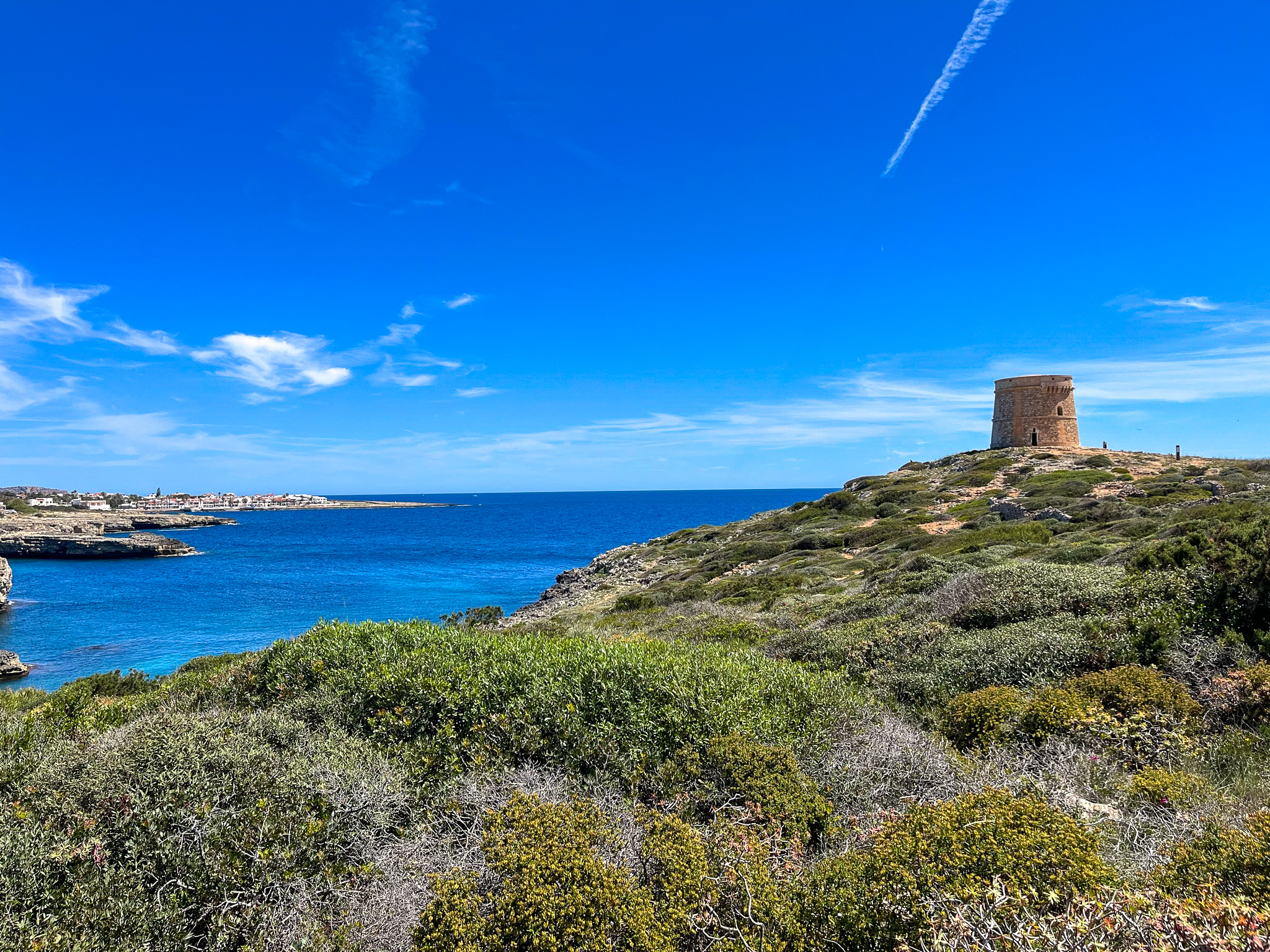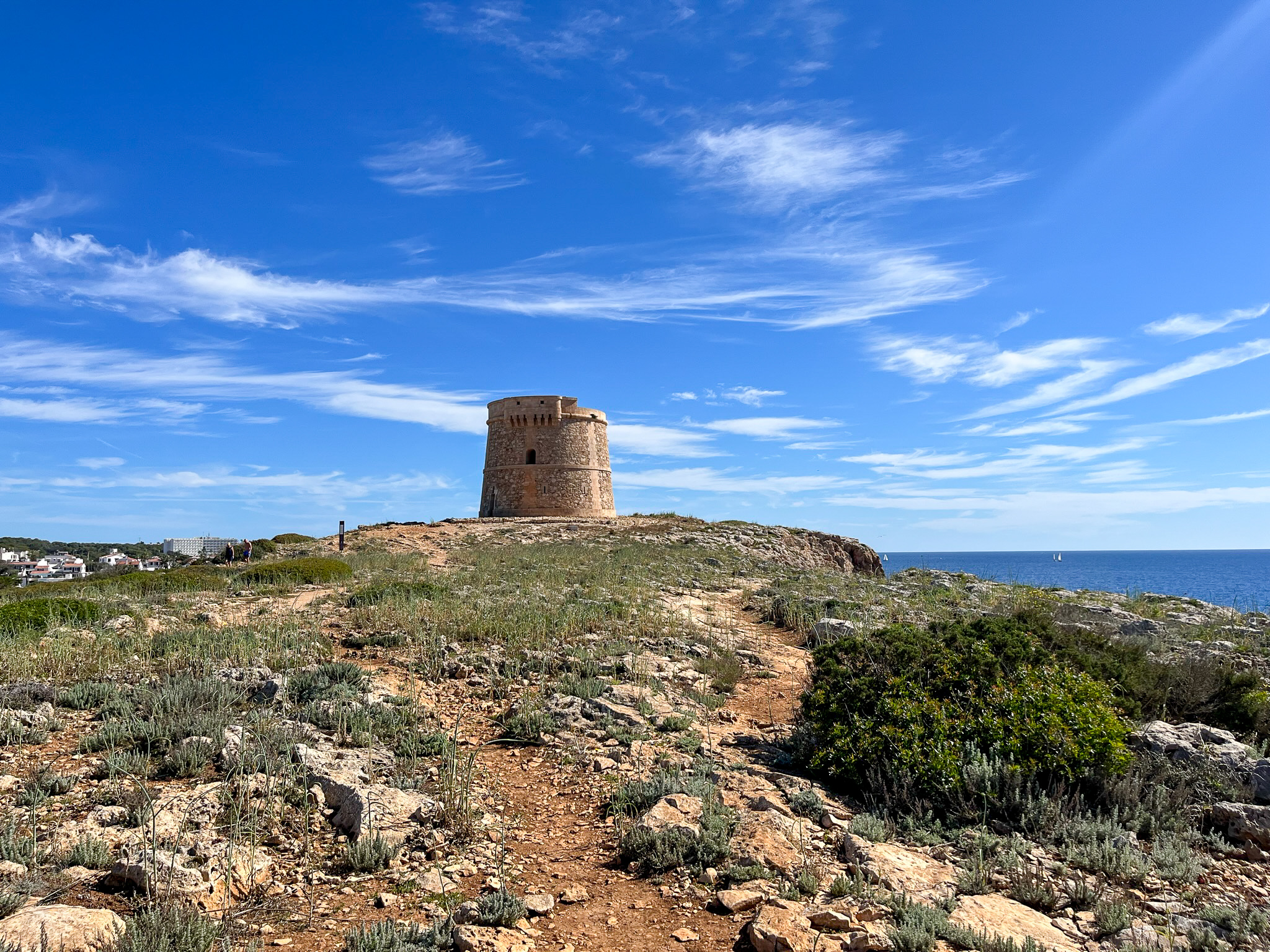 Comienza tu recorrido en Punta Prima, donde disfrutarás de unas vistas panorámicas de la Isla del Aire, coronada por su emblemático faro. Continúa por el Camí de Cavalls durante aproximadamente 1,5 km hasta llegar a la Torre de Alcaufar, una torre de defensa del siglo XVIII que formaba parte del sistema de protección de la isla contra piratas y corsarios.