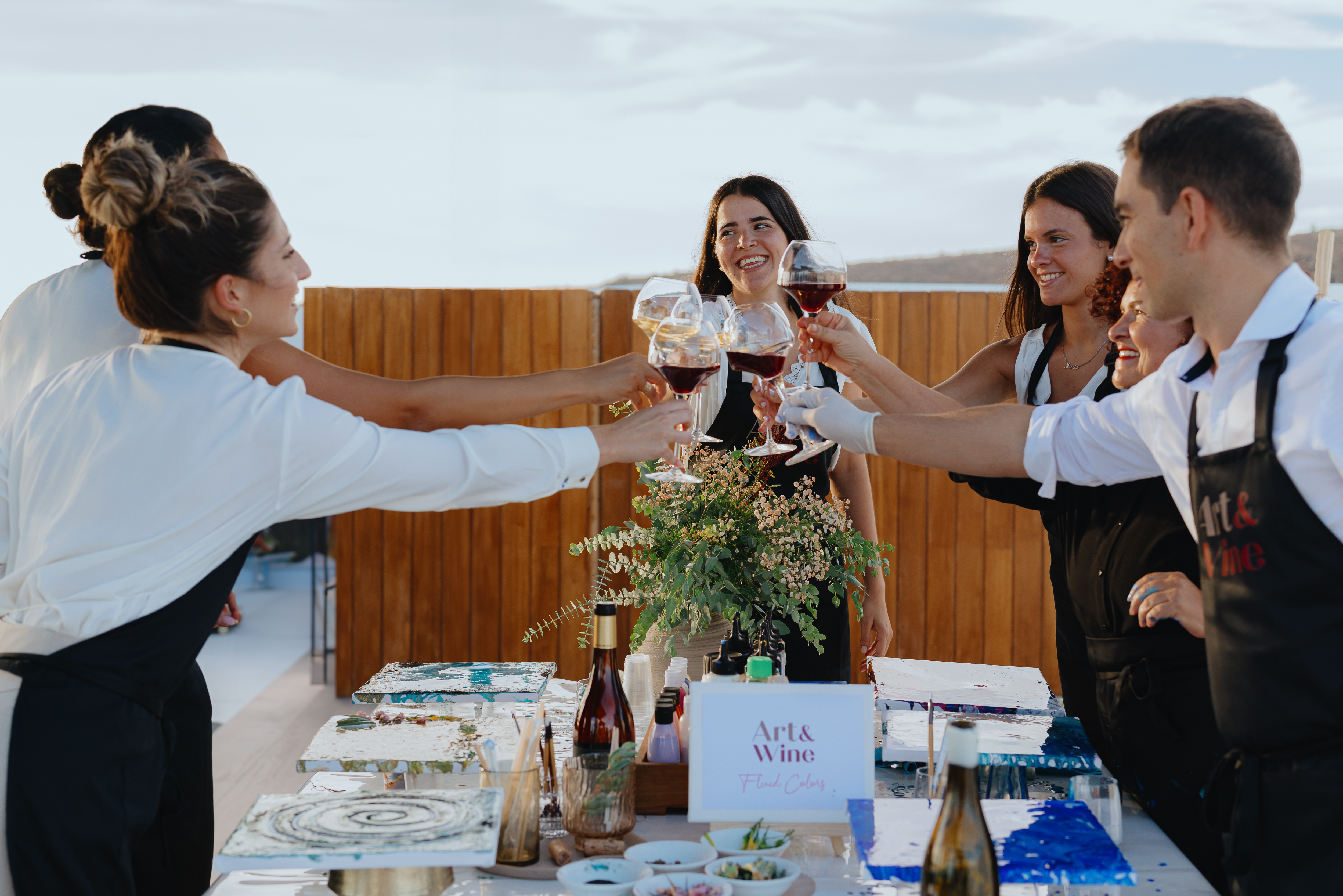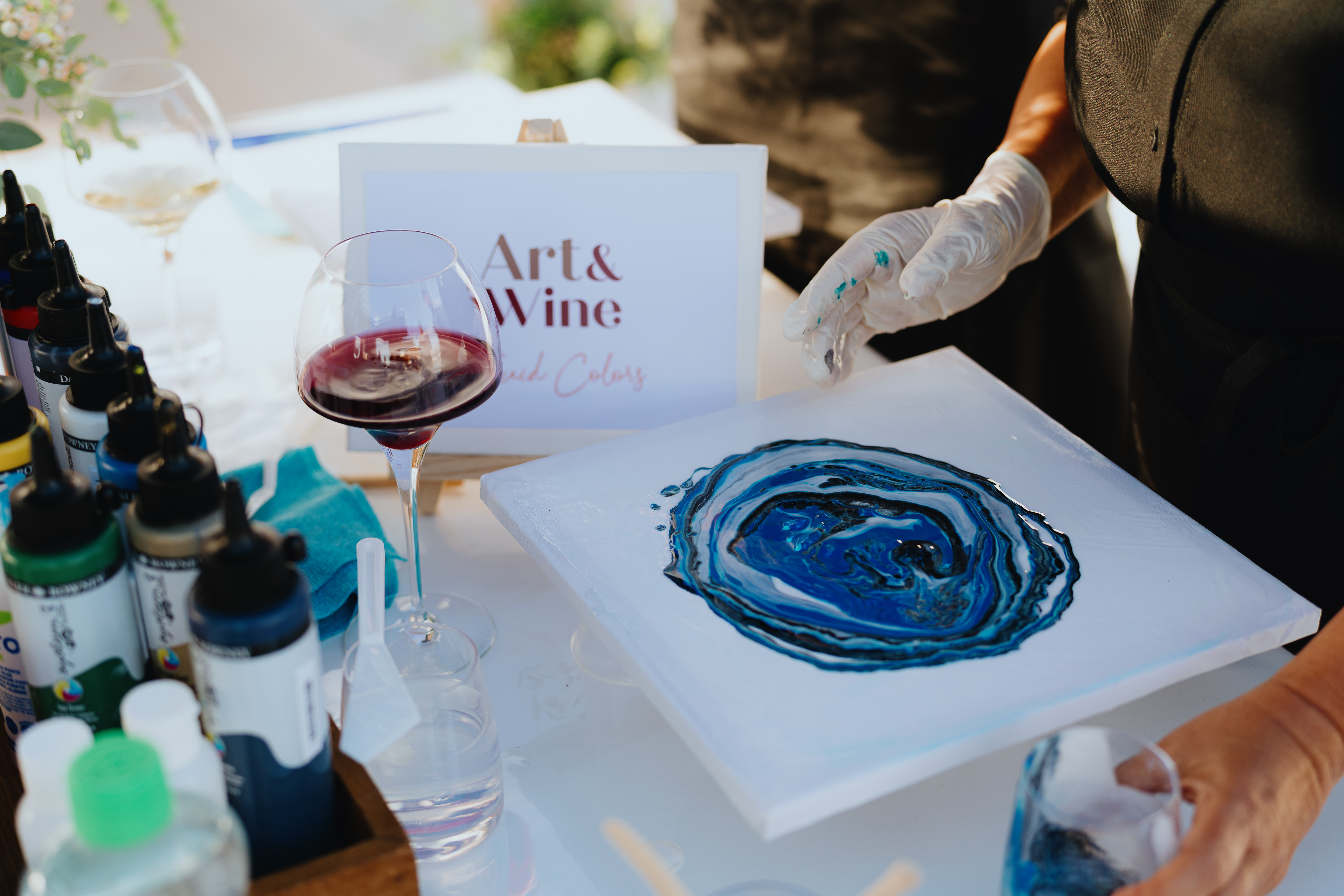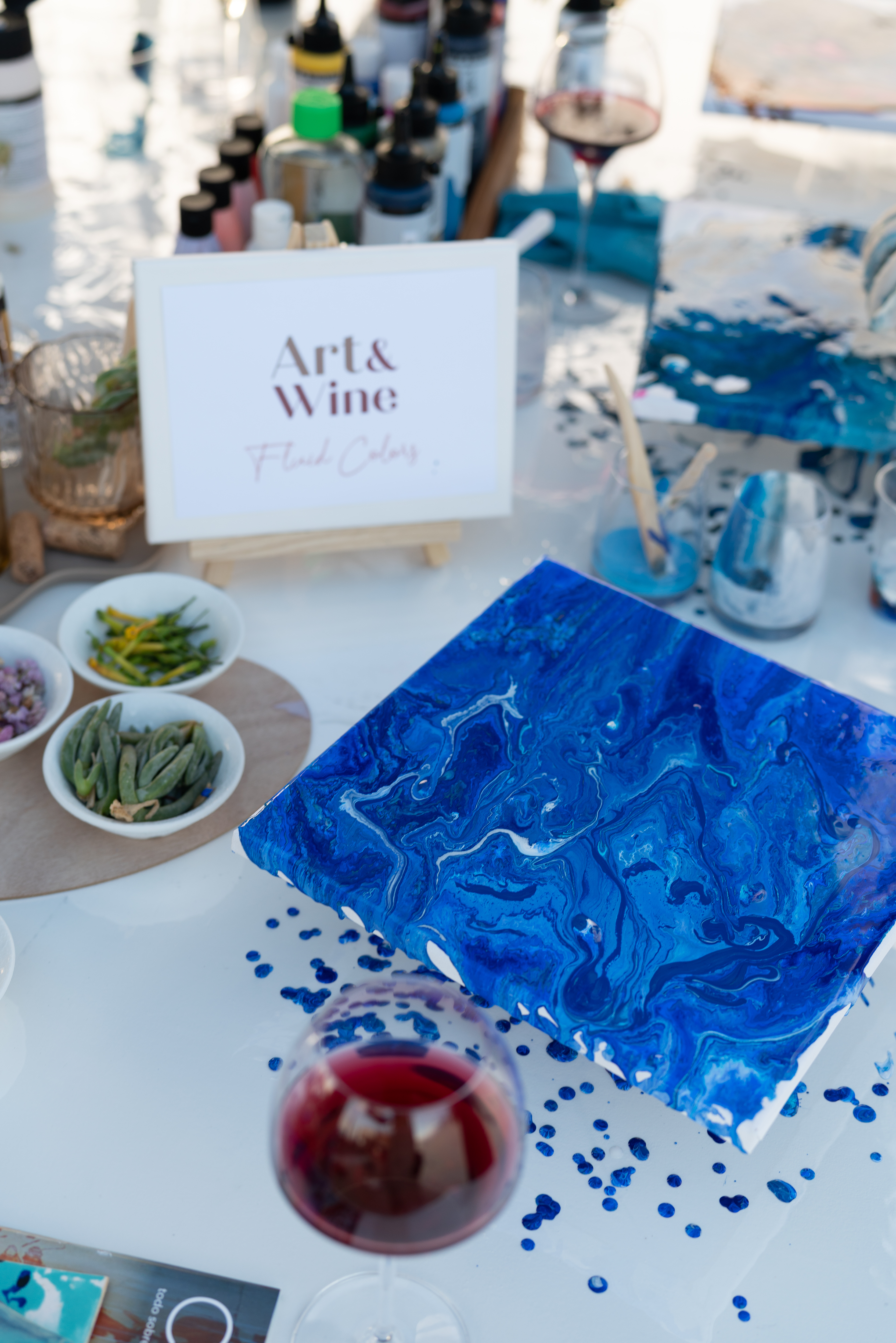 Art & Wine comienza con una cata de vinos seleccionados que corresponden con el tema elegido. Durante esta fase, exploramos los aromas, las variedades de uvas y los terroirs de las Islas Canarias, lo que nos inspira para la siguiente fase artística. Tras la cata, nos sumergimos en un taller de Fluid Art, donde podrás liberar tu creatividad.