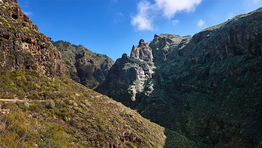 Posteriormente, la ruta continúa ascendiendo por un cañón formado por rocas volcánicas labradas pacientemente por el paso de los milenios. Cruzaremos por El Bailadero de las Brujas y La Cogedera, espacios ideales para descansar, reponer fuerzas y respirar un aire fresco y puro. Y descubriremos miradores para disfrutar del increíble paisaje que vamos dejando atrás mientras ascendemos.