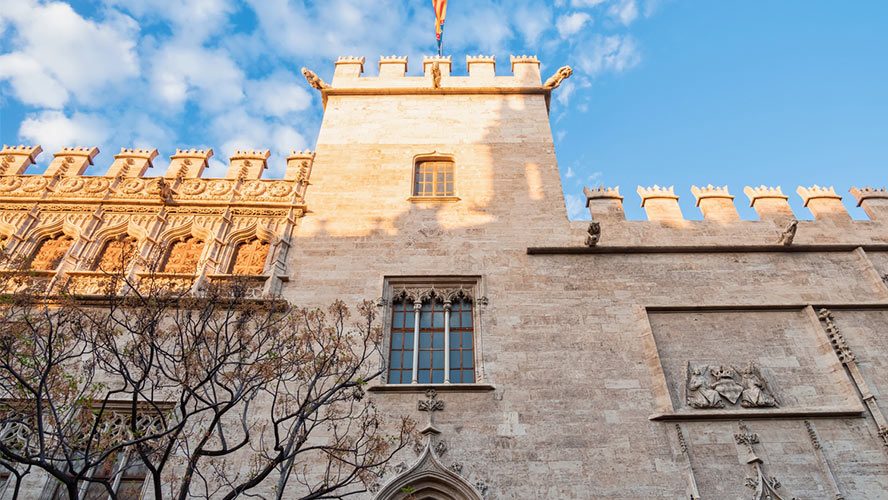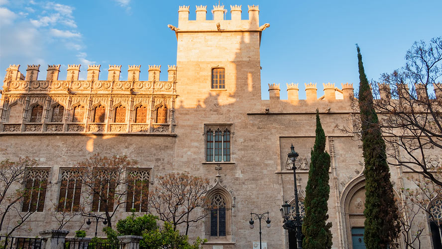 Así llegamos al Consulado del Mar, una sala rectangular de estilo renacentista –se construyó como anexo a la lonja en el siglo XVI- donde se celebraban sesiones en las que los cónsules de comercio arbitraban sobre disputas mercantiles y marítimas. Es la llamada Cámara Dorada, dominada por un hermoso techo gótico de madera policromada que decoró la Casa de la Ciudad hasta el siglo XIX, siendo más tarde trasladado aquí. Nuestro recorrido concluye en el remanso de paz del Patio de los Naranjos, poblado con estos árboles y cipreses en torno a una fuente central.