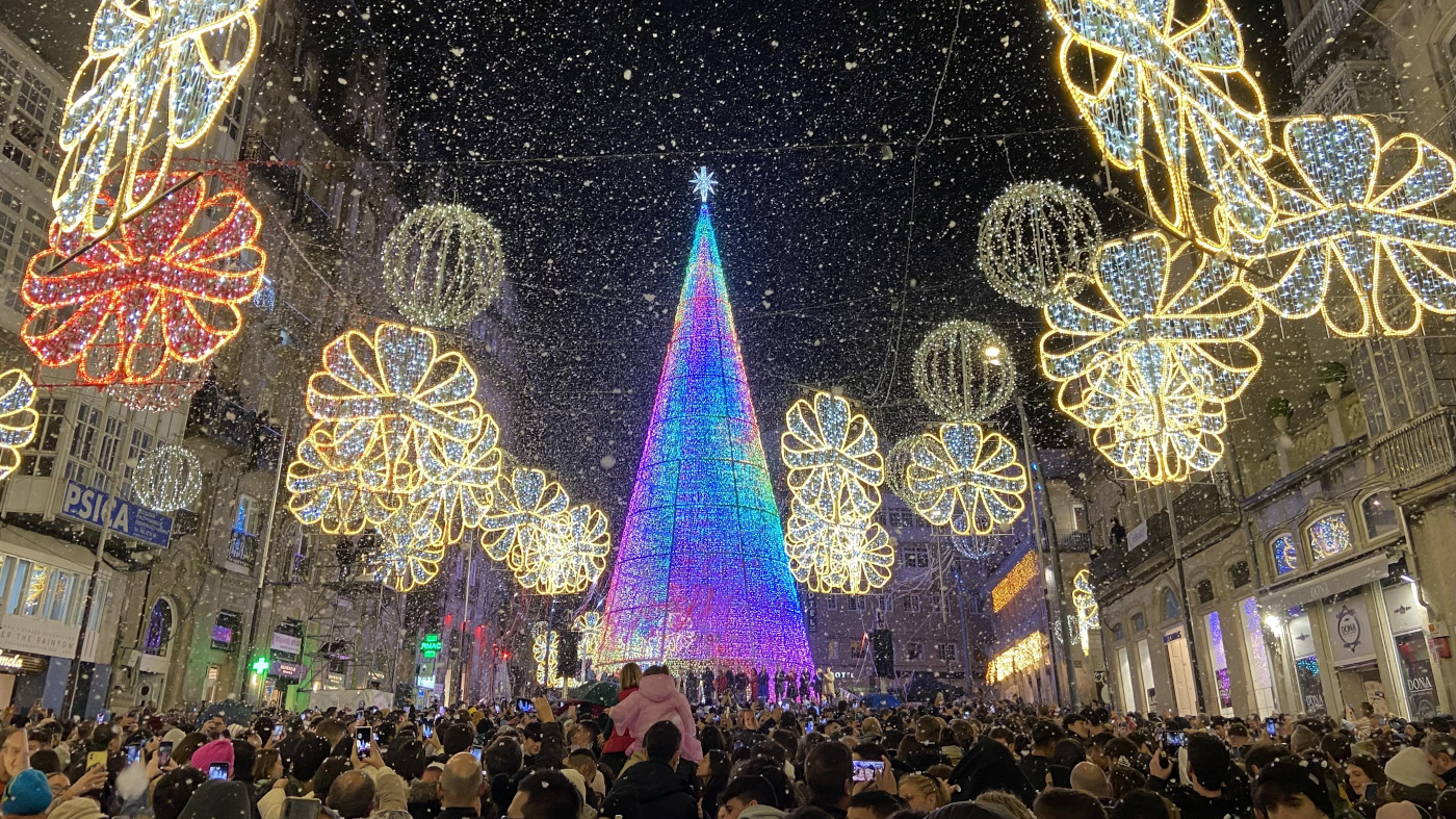 Una vez en tierra firme, nos dirigiremos al centro histórico de Vigo. Allí, nos perderemos entre las calles de una ciudad nacida de la conexión con el puerto. Caminando llegaremos a la calle Príncipe, donde os dejaremos cuatro horas de tiempo libre para pasear y ver las luces de Navidad de Vigo. A continuación, nos dirigimos a Vigo, famosa por su espectacular decoración navideña. Sus millones de luces LED transforman la ciudad en un espectáculo de color, con su árbol gigante, túneles luminosos y figuras decorativas que sorprenden a todos. Nuestro guía les llevará a los puntos más destacados para que vivan al máximo esta vibrante exhibición.