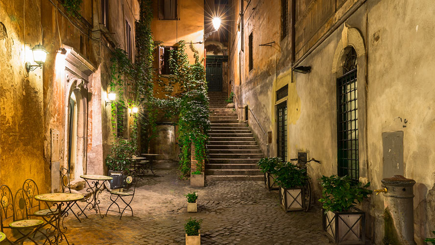 Este barrio colorido, con aire bohemio, es famoso por sus restaurantes de comida típica italiana y, sobre todo, por ser una de las zonas más frecuentadas en la noche romana. Ofrece una gran cantidad de bares, pubs, restaurantes, lugares con música en vivo y buen ambiente. Sus calles adoquinadas están rodeadas de edificios de estilo medieval adornados con farolillos que nada tienen que ver con la imagen que se proyecta por la mañana. Mientras de día duerme tímidamente, por la noche el barrio de Trastevere despierta y bulle sin descanso. El punto de encuentro más común es la plaza Santa María, donde se reúnen tanto turistas como romanos para tomar el aperitivo, cenar o decidir donde continuarán la noche.