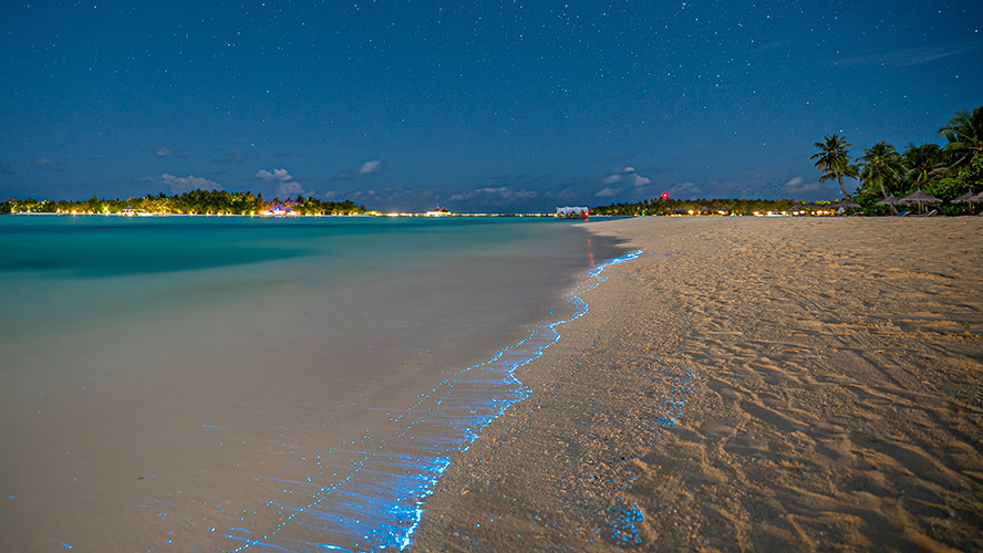 La bioluminiscencia de la playa de Vaadhoo es uno de los fenómenos naturales más mágicos que ocurren en Maldivas. Se produce por la presencia de diodos, una especie de plancton resplandeciente, que en la reacción química con el oxígeno se convierte en una luz azul brillante, llenando las olas del mar de pequeñas lucecitas brillantes.