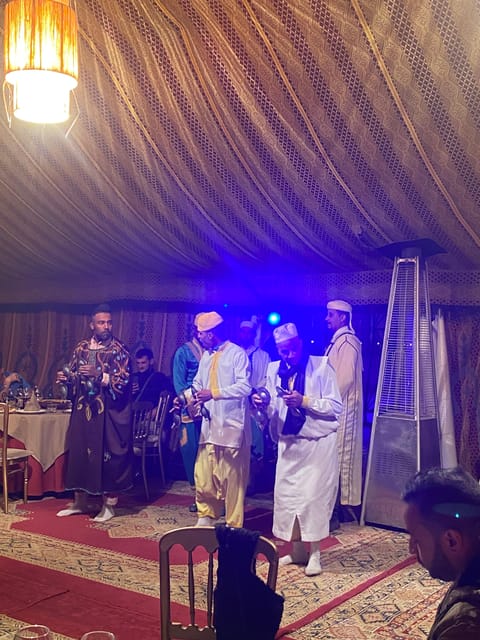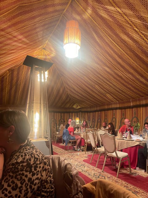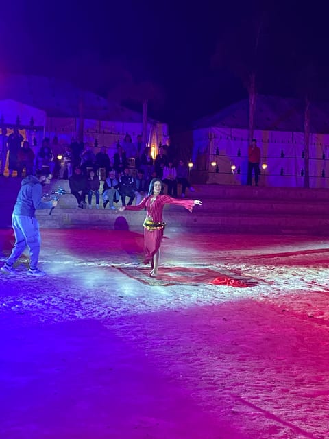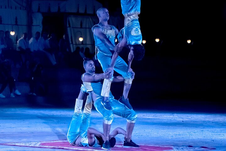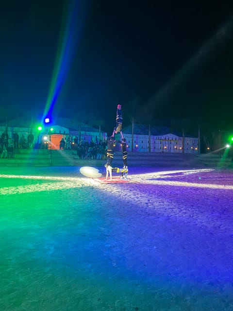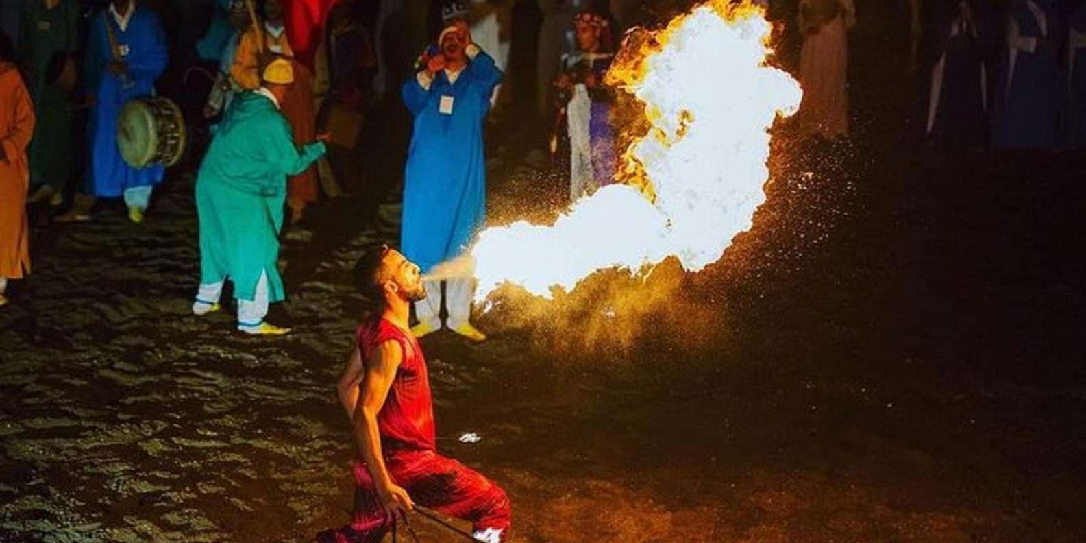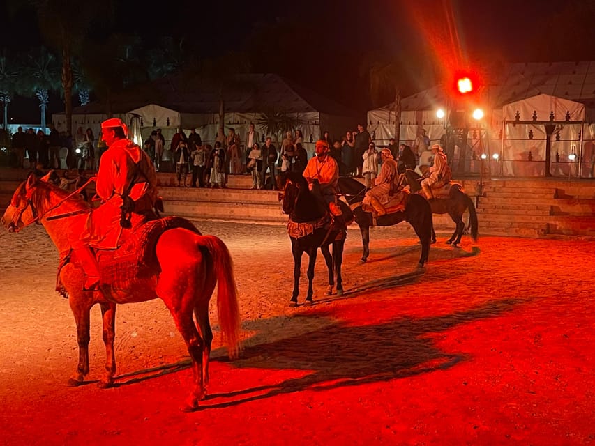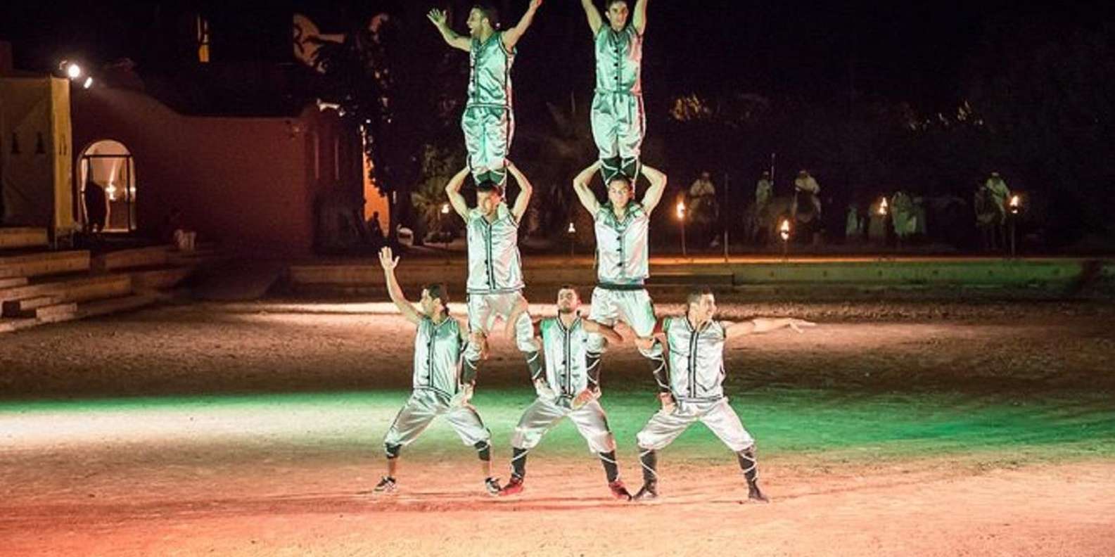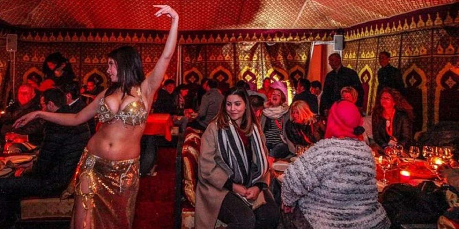 1. Llegada y bienvenida marroquí: comience la noche con una vibrante bienvenida marroquí. Déjese recibir por hábiles bailarines que marcan la pauta para una noche llena de maravillas culturales y experiencias inolvidables.
