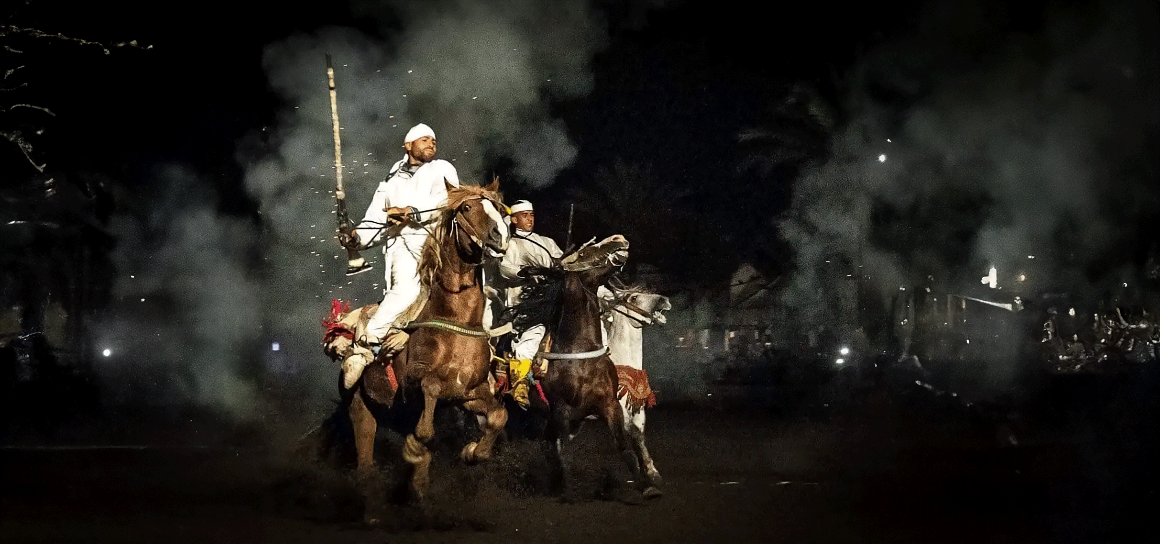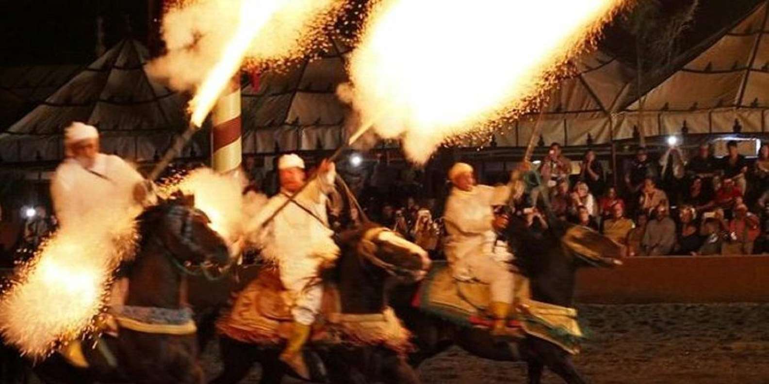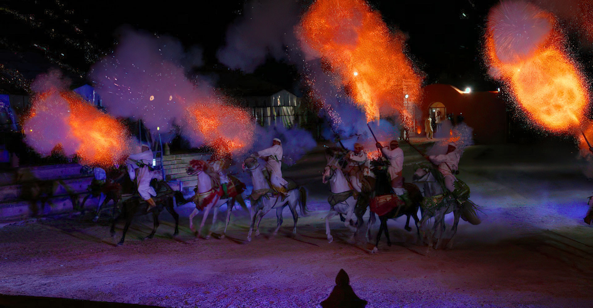 6. Fantasia Show: culmine la noche con el gran «Fantasia Show» en el estadio. Sé testigo de una deslumbrante muestra de equitación tradicional, que simboliza la destreza ecuestre bereber y crea el broche final perfecto para tu inmersiva experiencia marroquí.