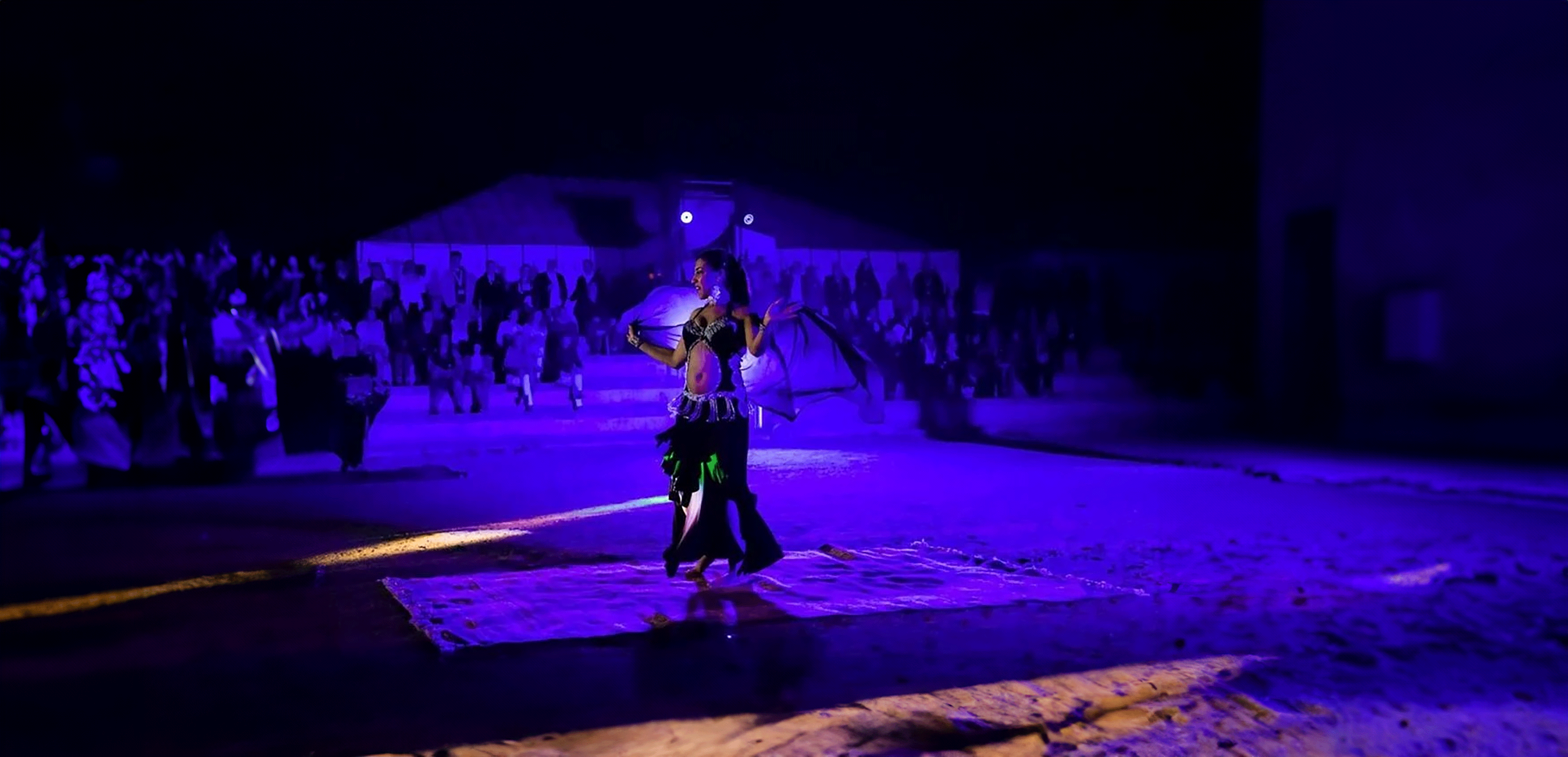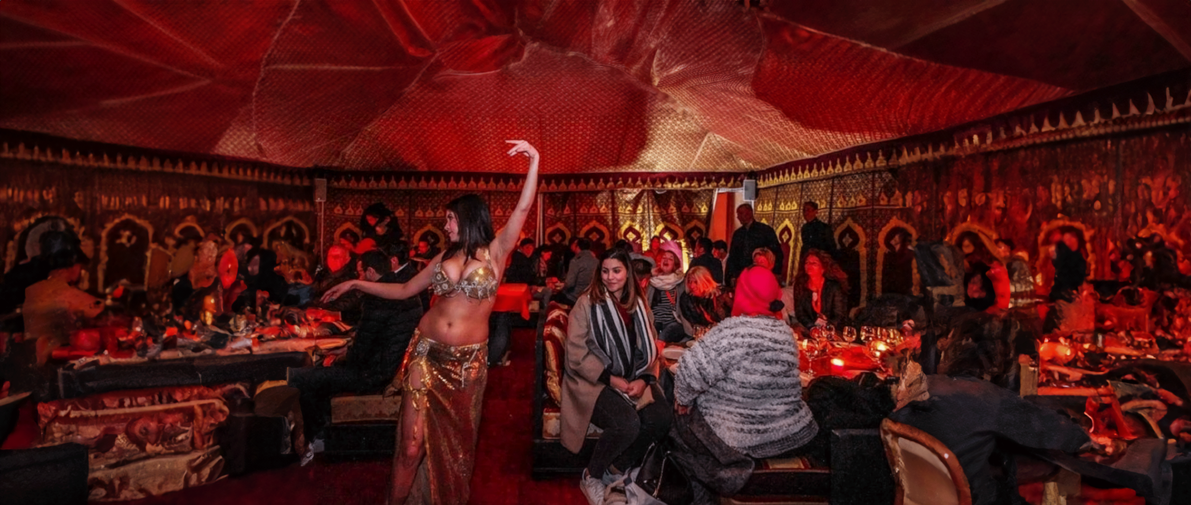 2. Caidal Tent Experience: sumérjase en el lujoso abrazo de su carpa Caidal privada, adornada con una decoración tradicional. Este entorno auténtico y cómodo es perfecto para las festividades de la noche.