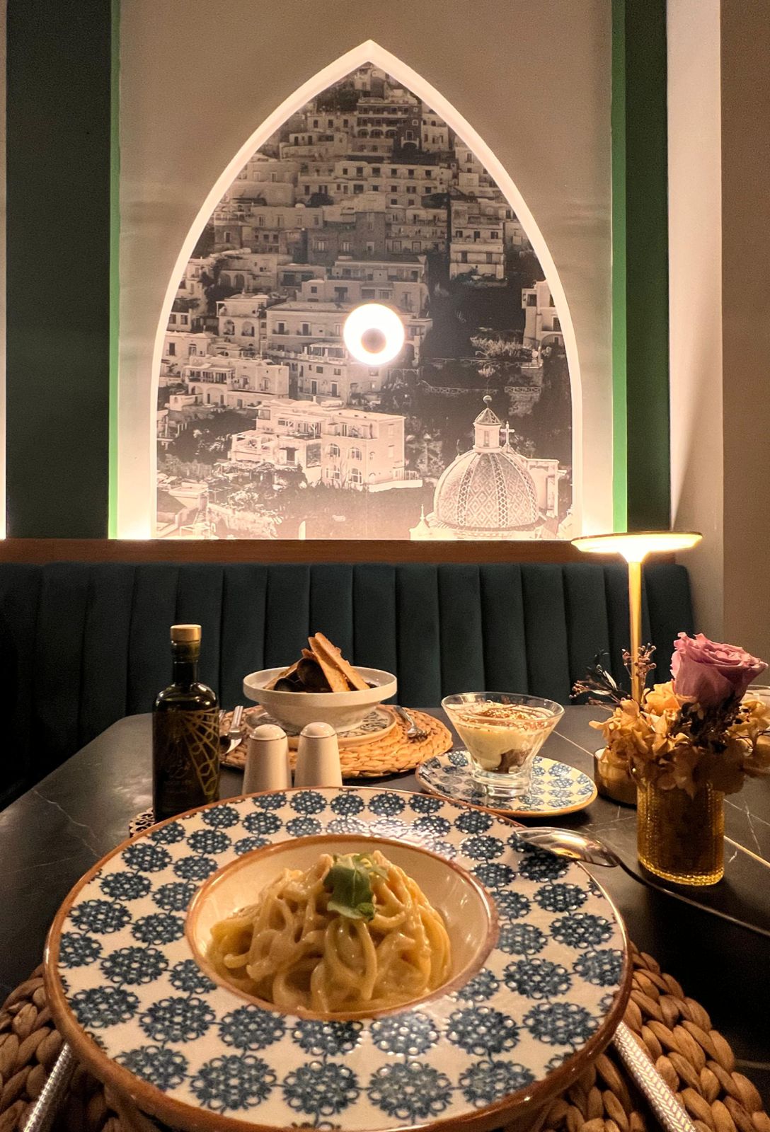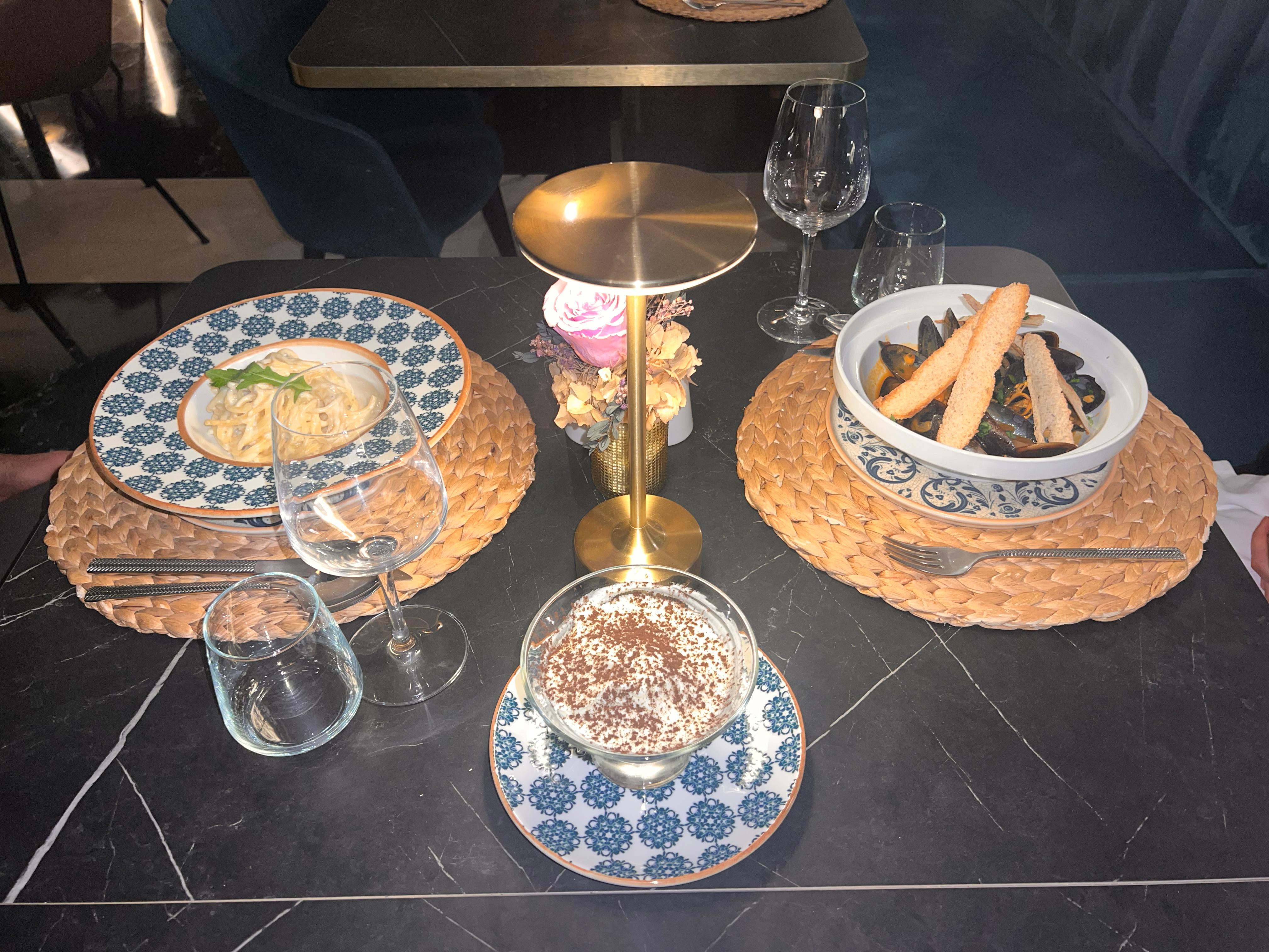 El ambiente suele ser elegante y relajado: mesas bien presentadas, iluminación cálida y platos pensados para disfrutar sin prisa, como en una auténtica “dolce vita”