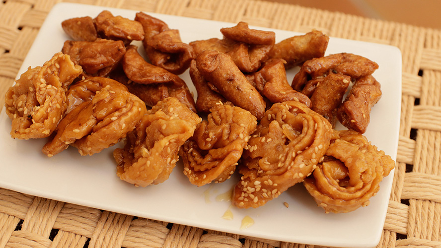 También heredados del mundo árabe, se trata de pastelitos por lo general elaborados a base de masa filo o harina de trigo, rellenos de abundantes frutos secos o cabello de ángel, fritos y decorados con abundante miel y azúcar glass.