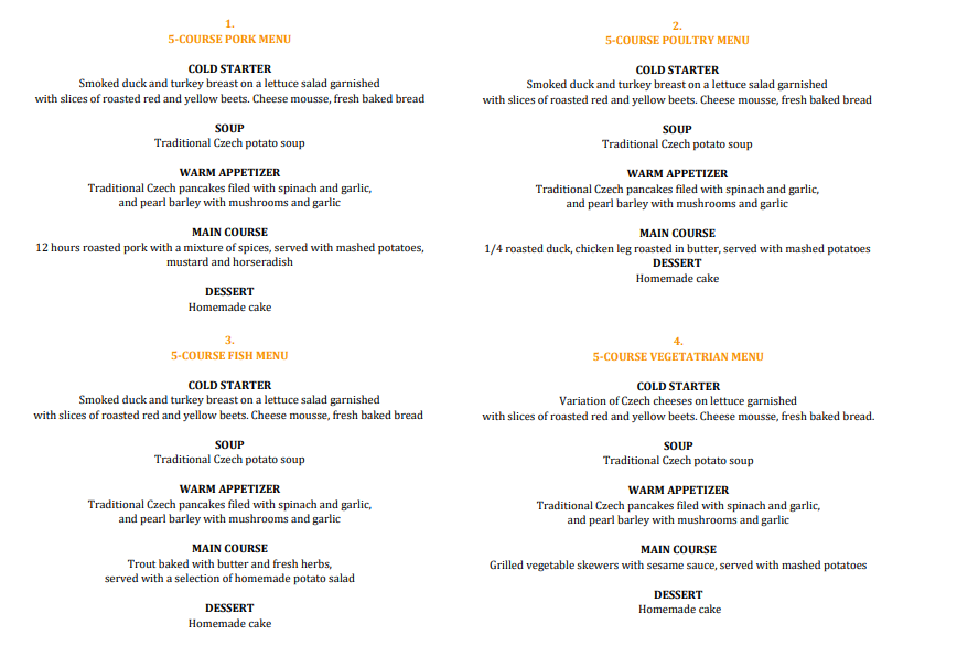 Krčma U Pavouka - Celetná 595/17, Prague 1. Our guide will be standing in front of the restaurant with the orange umbrella.