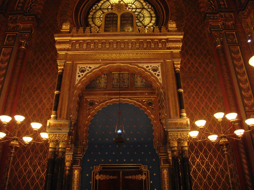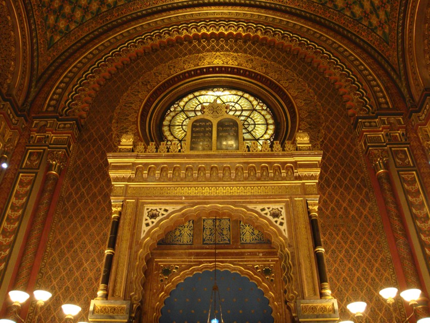 La sinagoga española de Praga es conocida como la sinagoga más bella de Europa. Fue construida en 1868 en el sitio de la casa de oración judía más antigua de Praga («la antigua sinagoga»), diseñada en estilo morisco. La extraordinaria decoración interior presenta un arabesco bajo de estuco con motivos islámicos estilizados, que también se aplica a las paredes, las puertas y las balaustradas de las galerías.