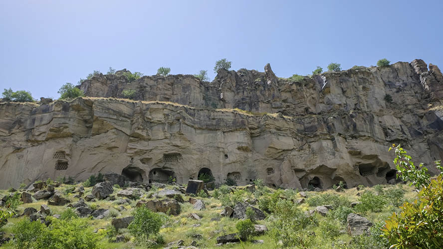 Muy cerca, en otro de los valles, podemos visitar una mezquita, con un minarete tallado en la roca muy meritorio, que nos habla de la época del Imperio otomano y de la llegada del Islam a la región. También hay un monasterio en el que podemos ver grabados rupestres y algunas zonas de viviendas bastante destruidas. Son muy curiosos los túneles subterráneos que conectan estos complejos con el otro lado del valle.