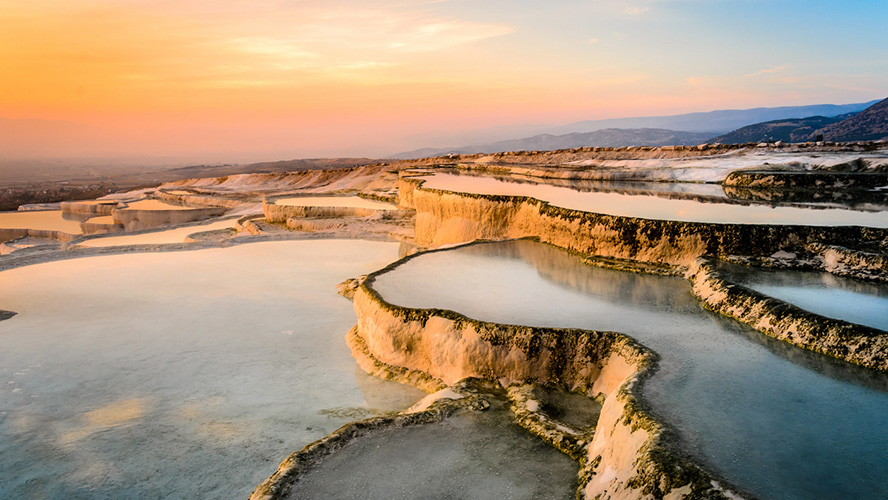 Ante todo, lo más llamativo de Pamukkale son sus travertinos. Es decir, las características formaciones geológicas en forma de cascada que se han formado por la acumulación sobre el talud de la montaña de restos de bicarbonato y calcio (creta) disueltos en las aguas termales que surgen en la zona.