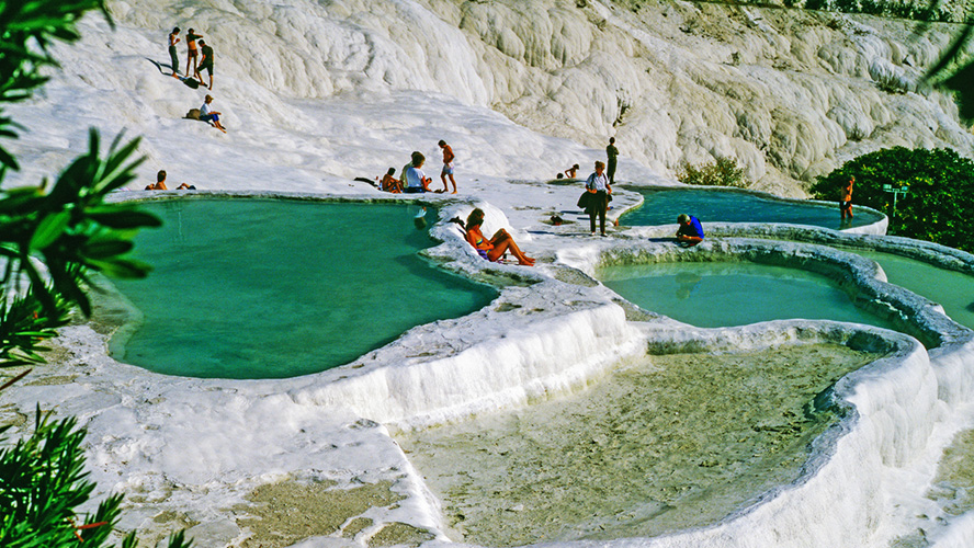 Pero en este conjunto geológico, tan gratificante como la vista resulta el tacto. De hecho, a Pamukkale muchos vienen a bañarse en sus aguas termales, a diferentes temperaturas y con propiedades mineromedicinales.