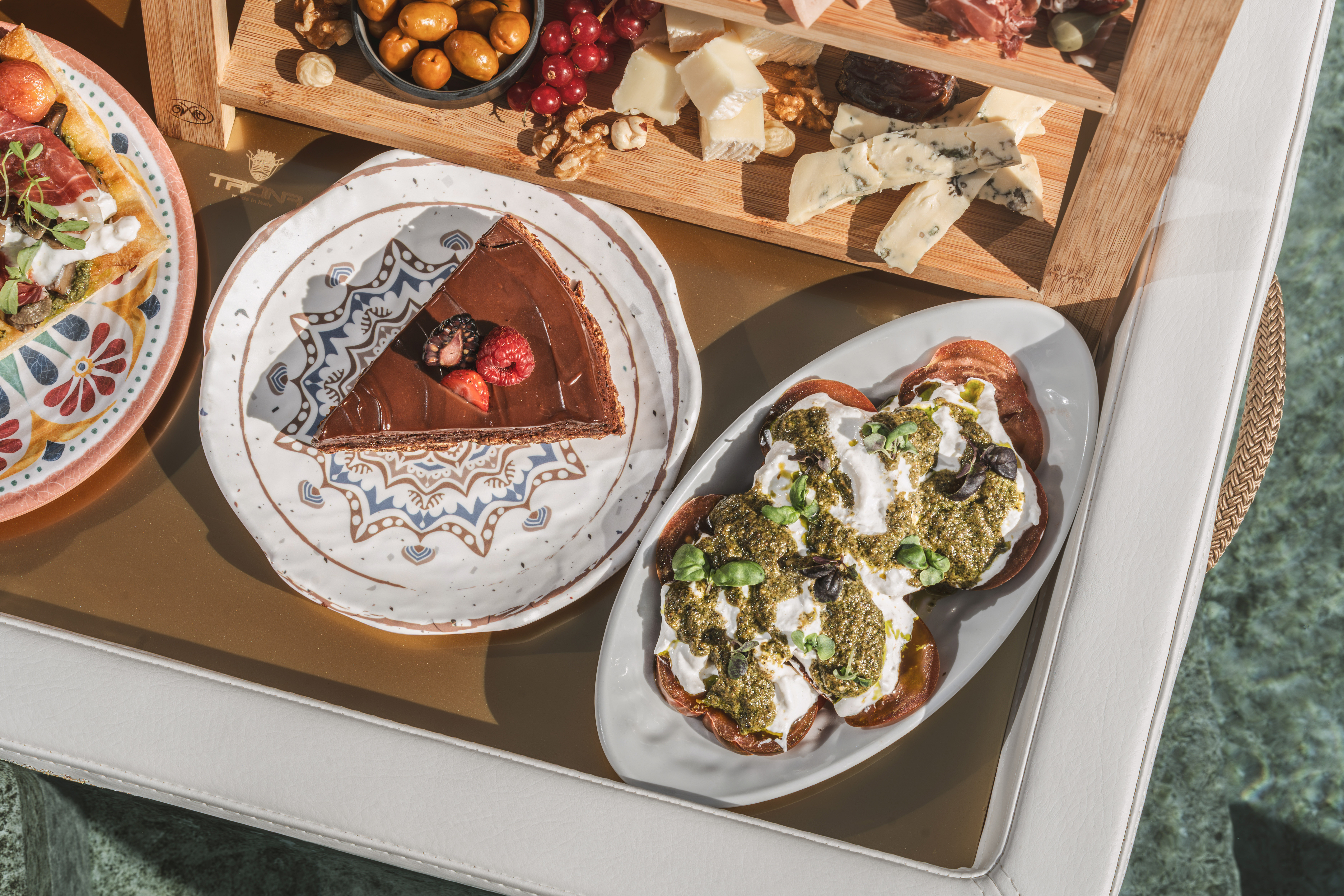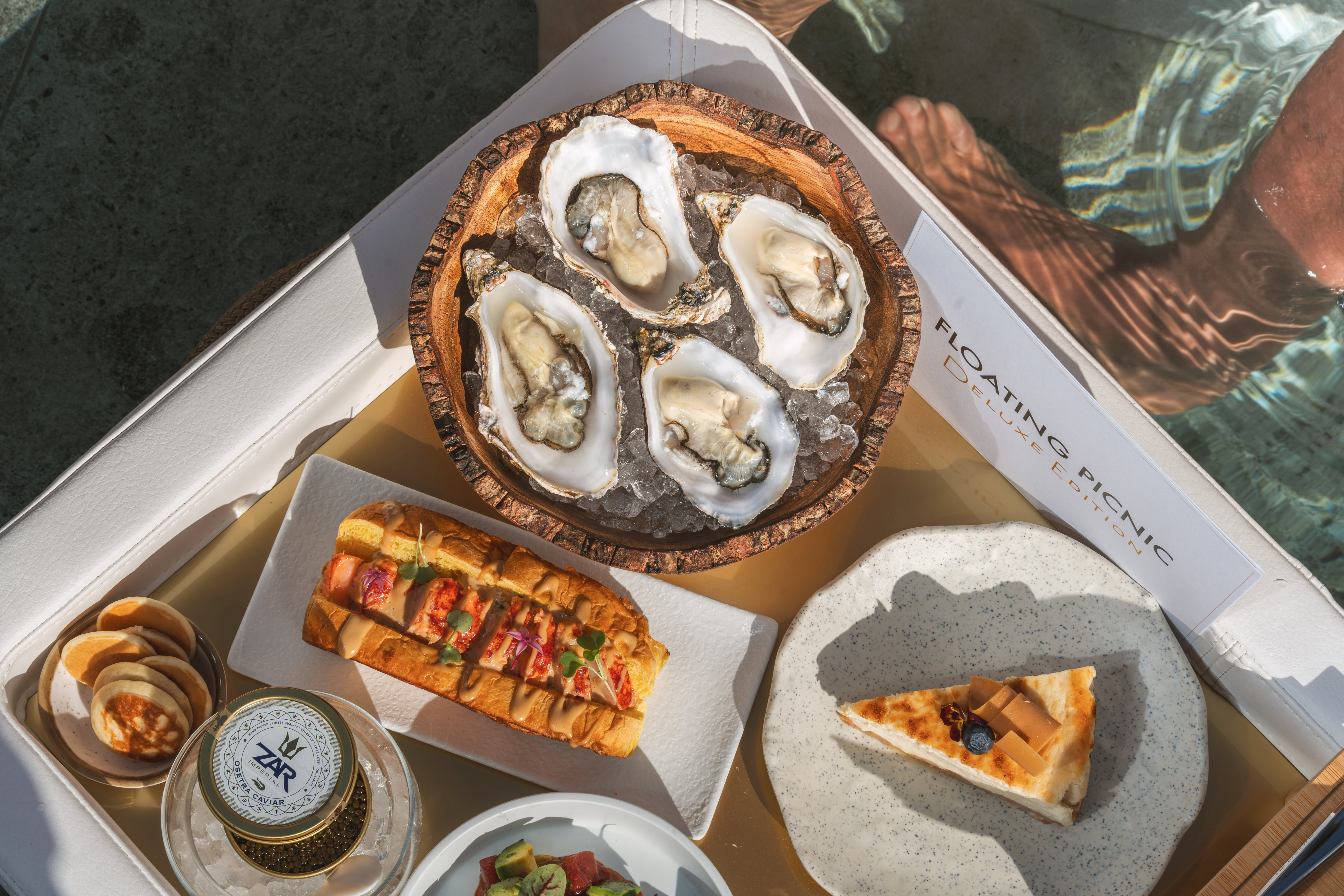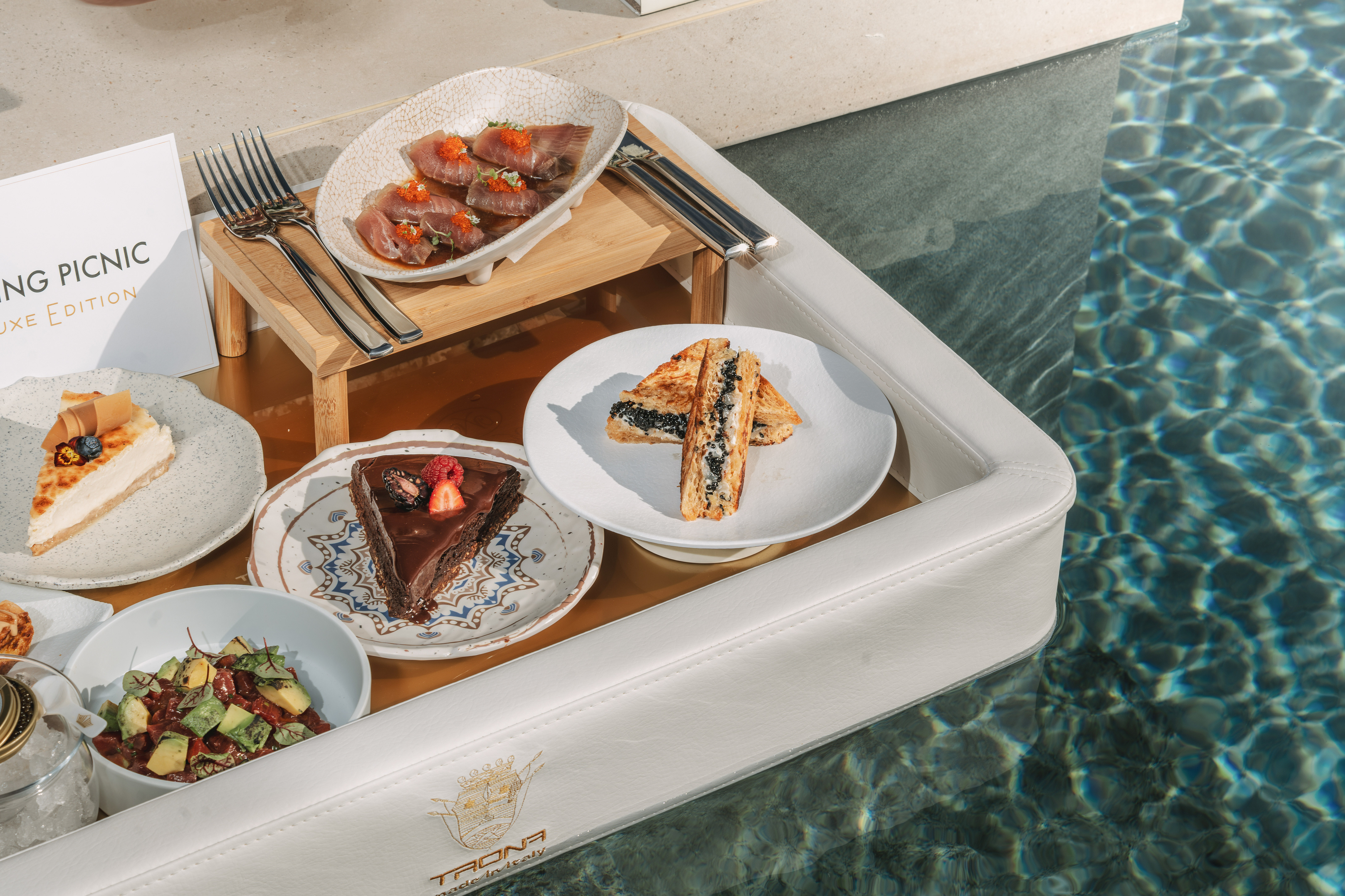 Les deux propositions sont présentées dans unplateau flottant, conçu pour créer un moment inoubliable et photogénique dans l'intimité de votre villa.