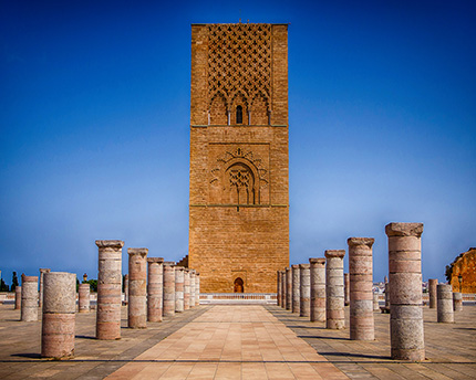 Construit en 1195, ce minaret faisait partie de la mosquée pharaonique et inachevée de Rabat, imaginée par le sultan Yaqub al-Mansur.