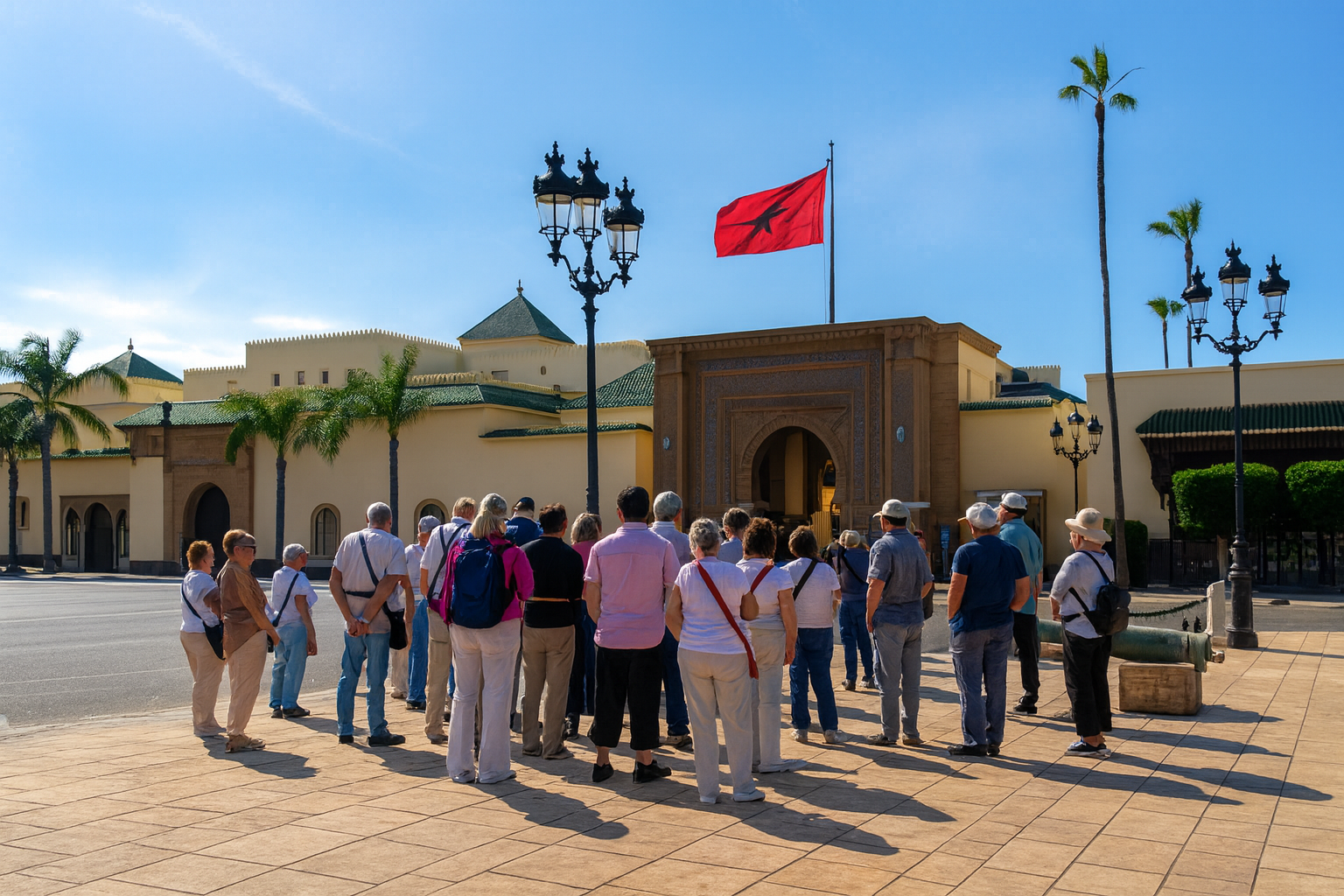 L’exploration continue au Palais Royal (vue extérieure) puis au site archéologique de Chellah, ancienne nécropole mérinide bâtie sur des ruines romaines, entourée de jardins luxuriants. Vous aurez également l’occasion de flâner dans les souks animés de la médina, parfaits pour découvrir l’artisanat marocain.