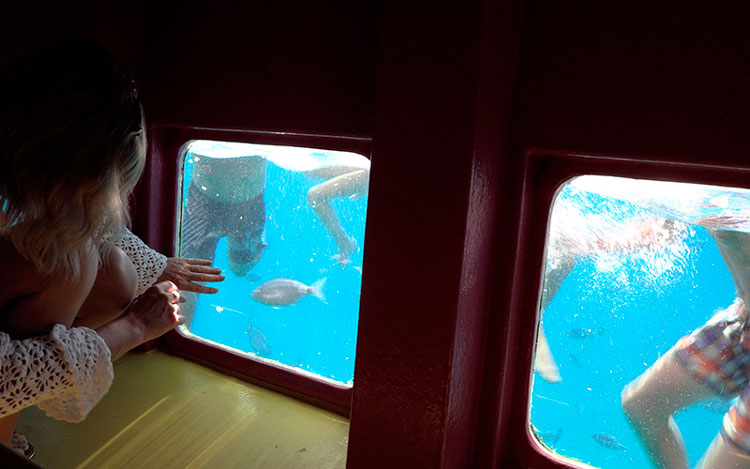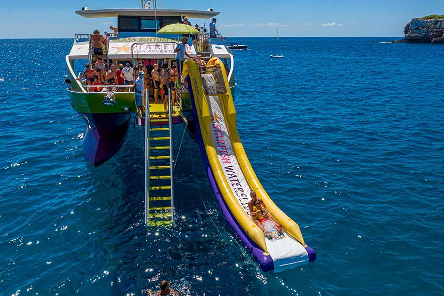 Disfrutarás una parada para bañarnos en las increíbles aguas cristalinas de la zona natural protegida de Cala Mondragó. Nuestro barco dispone de una zona de ventanas de visión submarina donde podrás disfrutar de la experiencia de observar el fondo marino y peces en su hábitat natural. Además disponemos de dos toboganes para que tu chapuzón sea más emocionante y divertido.