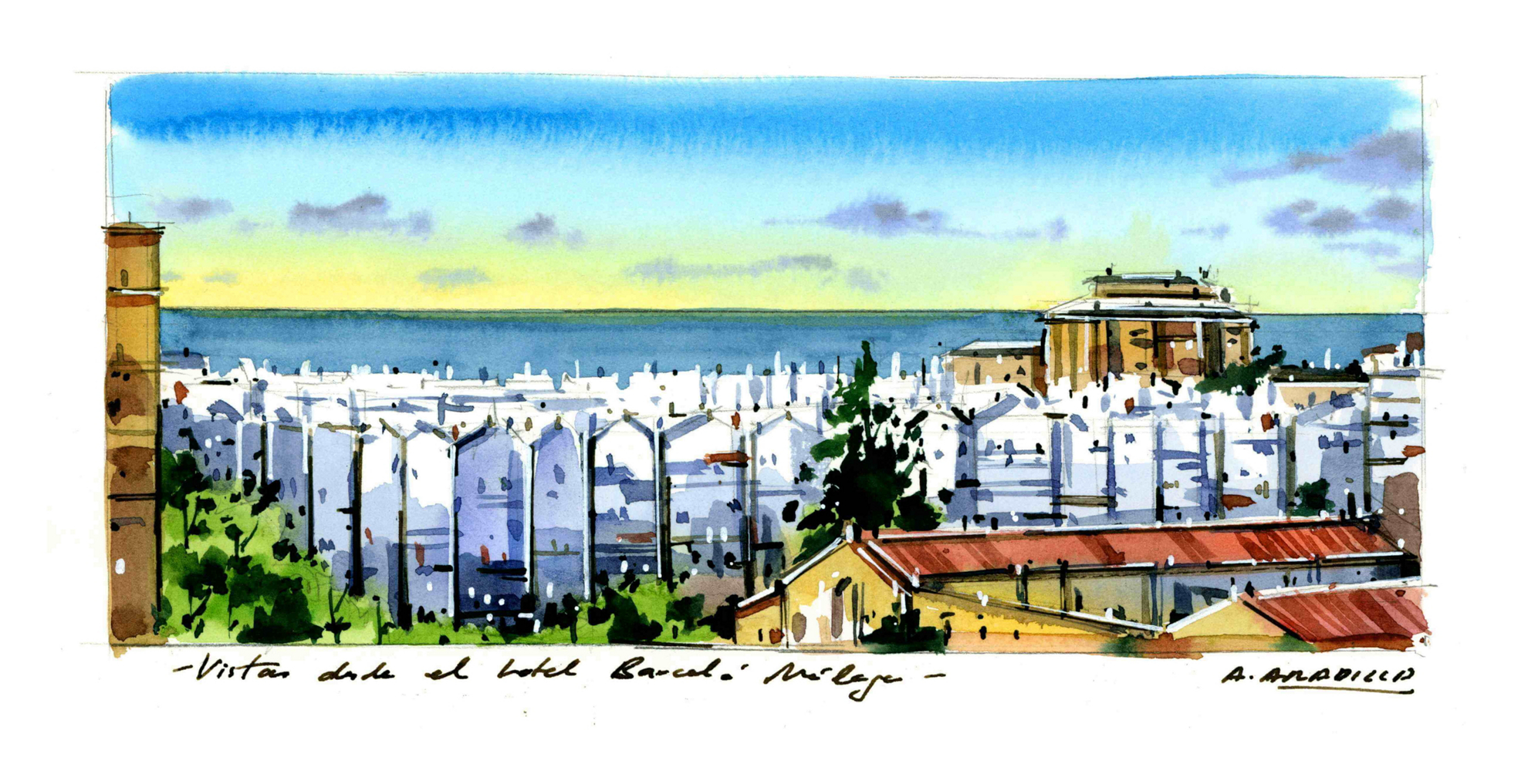 Pero no solo este enclave merece la pena ser inmortalizado en un trozo de papel. Cualquier rincón de Málaga es digno de ser retratado, como el horizonte desde el hotel Barceló Málaga, ilustrado por la artista Alicia Aradilla.