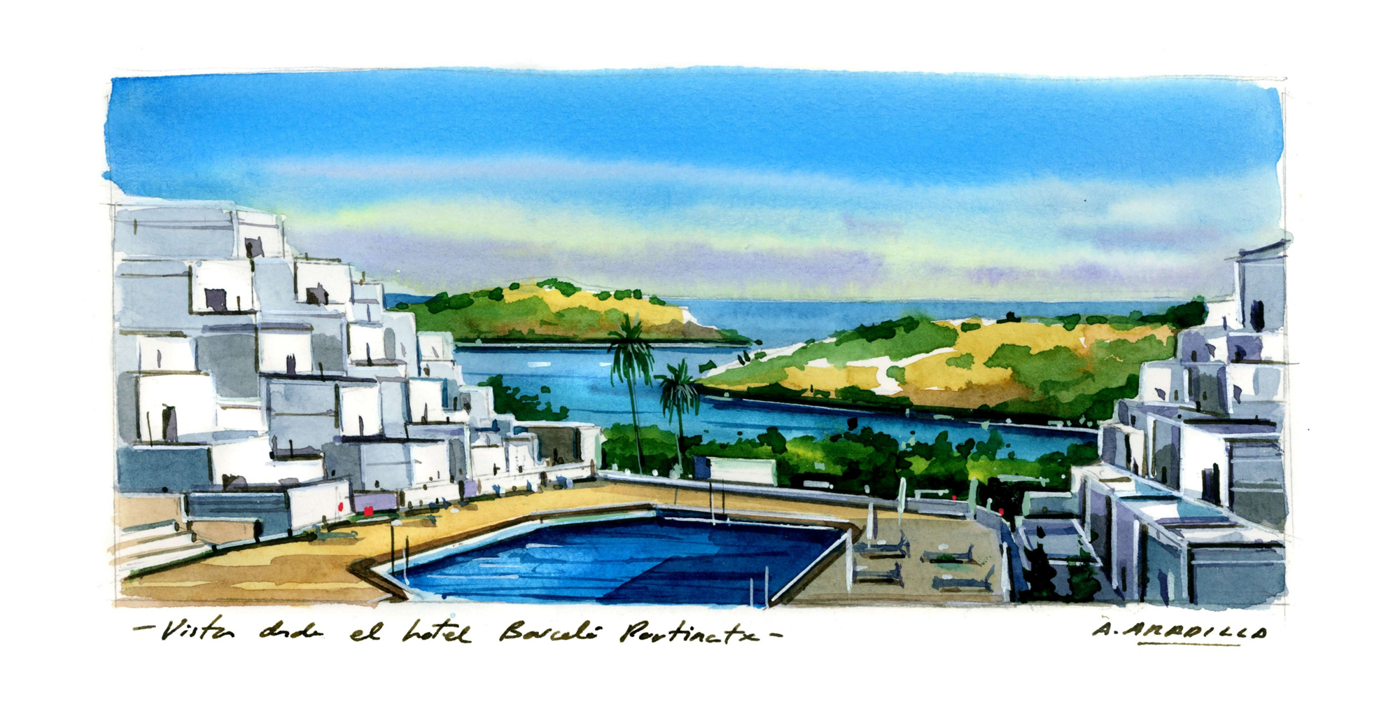 En el horizonte es común divisar algunos llaüts (barquitos) con el faro de la Punta de Moscarter al fondo. La postal ilustrada por Aradilla representa la cala donde se sitúa el hotel Barceló Portinatx, muy cerca del pueblo ibicenco San Juan.