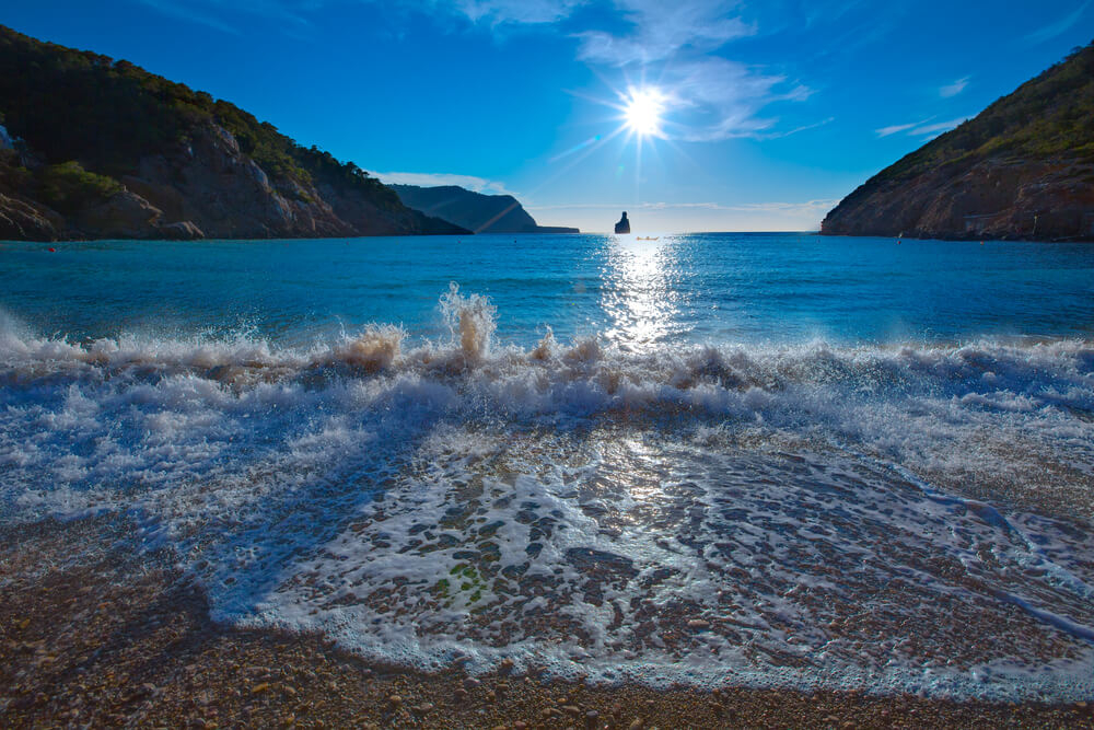Esta playa es famosa no solo en la isla, sino en toda la región, y no podía faltar si hablamos de las mejores playas de Ibiza. Su nombre hace referencia al color del agua, aunque más que blanca, es transparente. Nudista y sin apenas pendiente -lo que hace que a 50 metros de la orilla tan solo haya dos metros de profundidad-, es una playa más bien pequeña, y al no estar masificada es perfecta para bucear y relajarse alejado de la Ibiza de las fiestas, las go-gó y los miles de turistas bañados con champán.