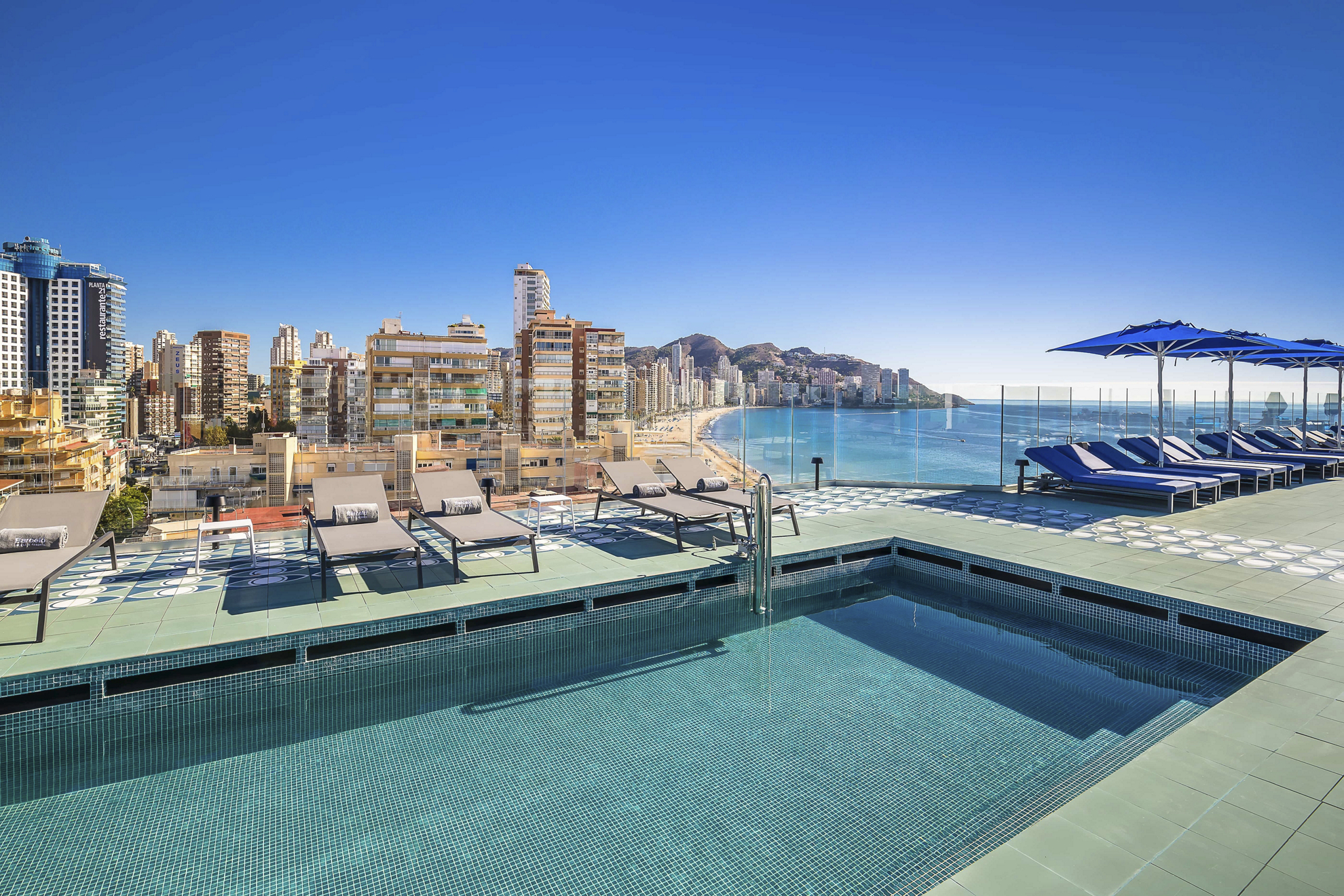 Otro rincón que me encantó del hotel fue el rooftop B-Heaven, una terraza en la azotea con vistas panorámicas de Benidorm. Tiene una piscina que invita a relajarse mientras ves cómo el sol cae sobre el mar. Ideal para tomar algo al atardecer, ya sea un cóctel, un vermut o un simple café con vistas.