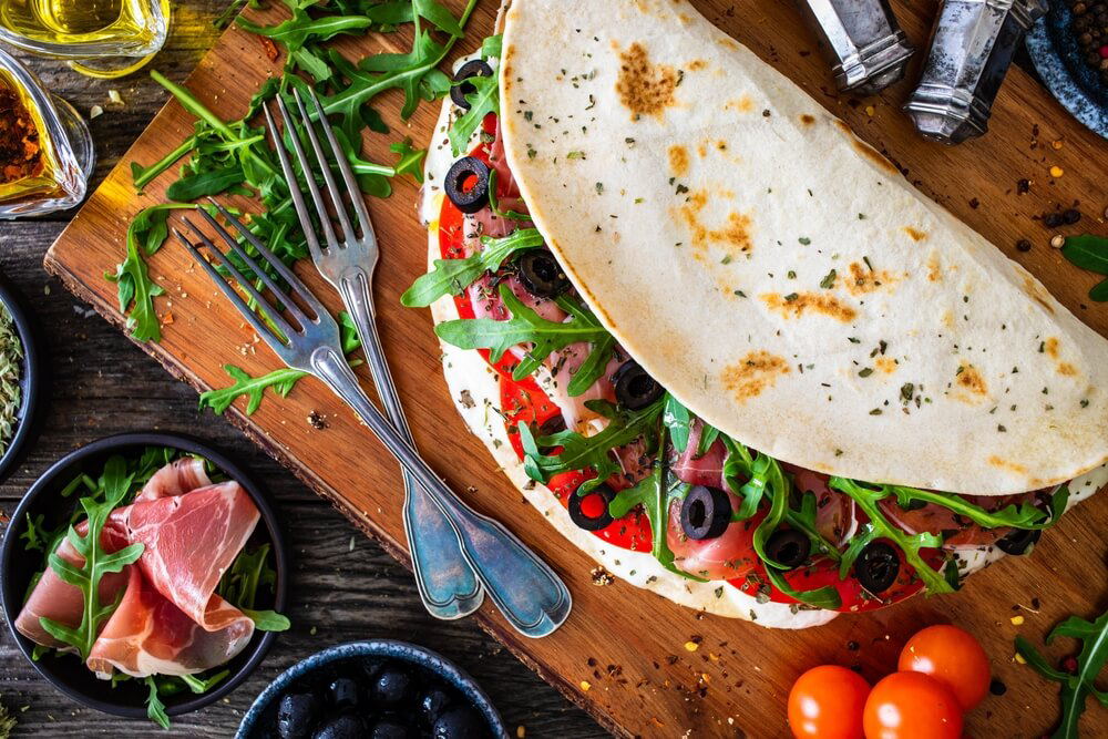 La piadina es una especie de bocadillo, original de la región de Emilia Romagna. La receta de la piadina se hace con una masa a base de harina de trigo, manteca de cerdo, sal y agua, que se prepara sobre un plato de terracota (la teglia). Se sirve caliente, rellena de verduras, tomate, jamón y mozzarella, o cualquier otro tipo de queso que se funda. Es una comida italiana riquísima que tienes que probar y que también tiene su pariente heredado en Argentina.